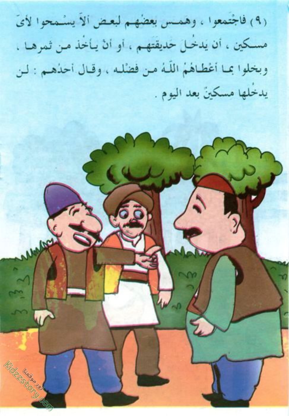 فاجتمعوا، وهمس بعضهم لبعض ألا يسمحوا لأي مسكين، أن يدخل حديقتهم، أو أن يأخذ من ثمرها، وبخلوا بما أعطاهم الله من فضله.