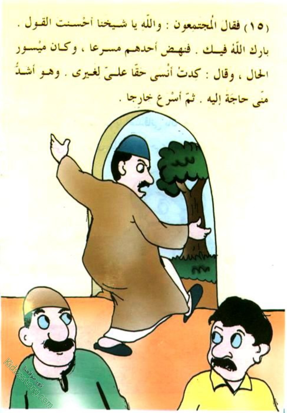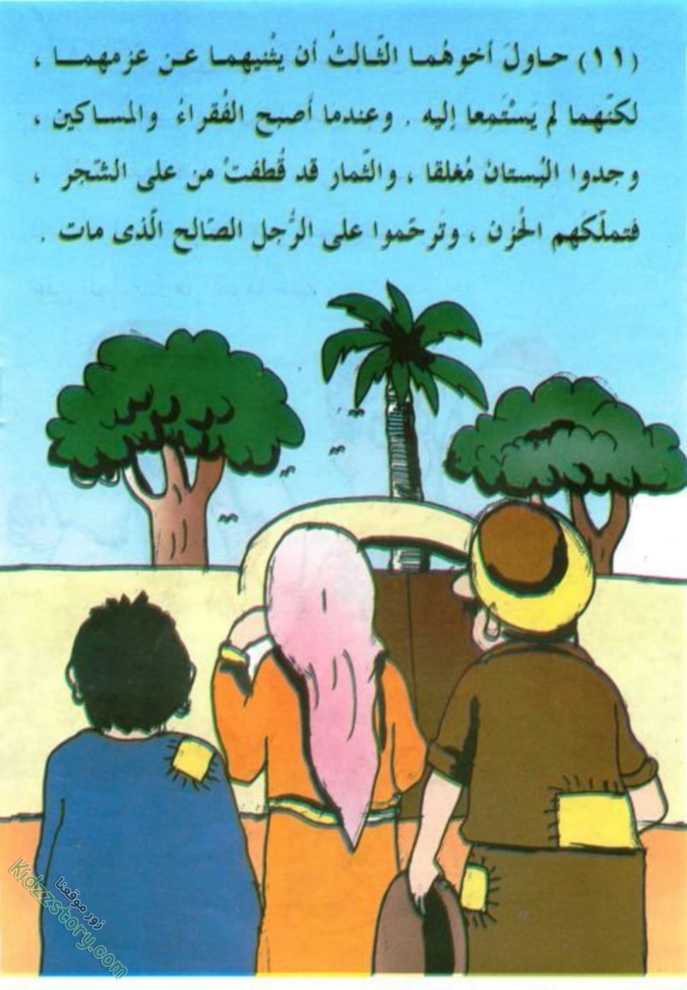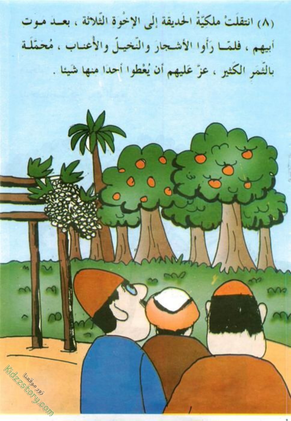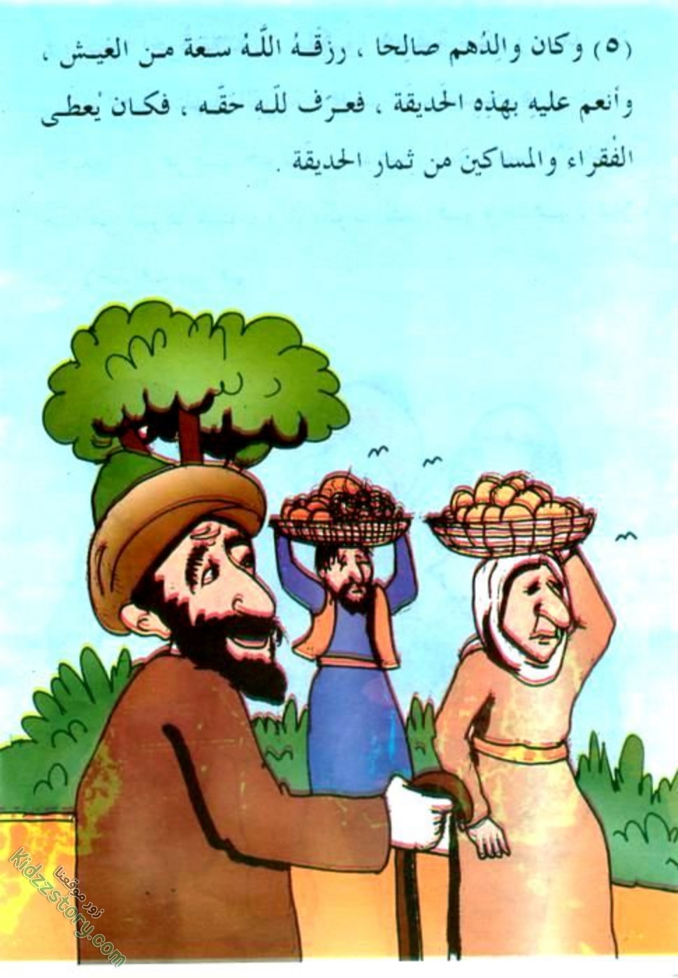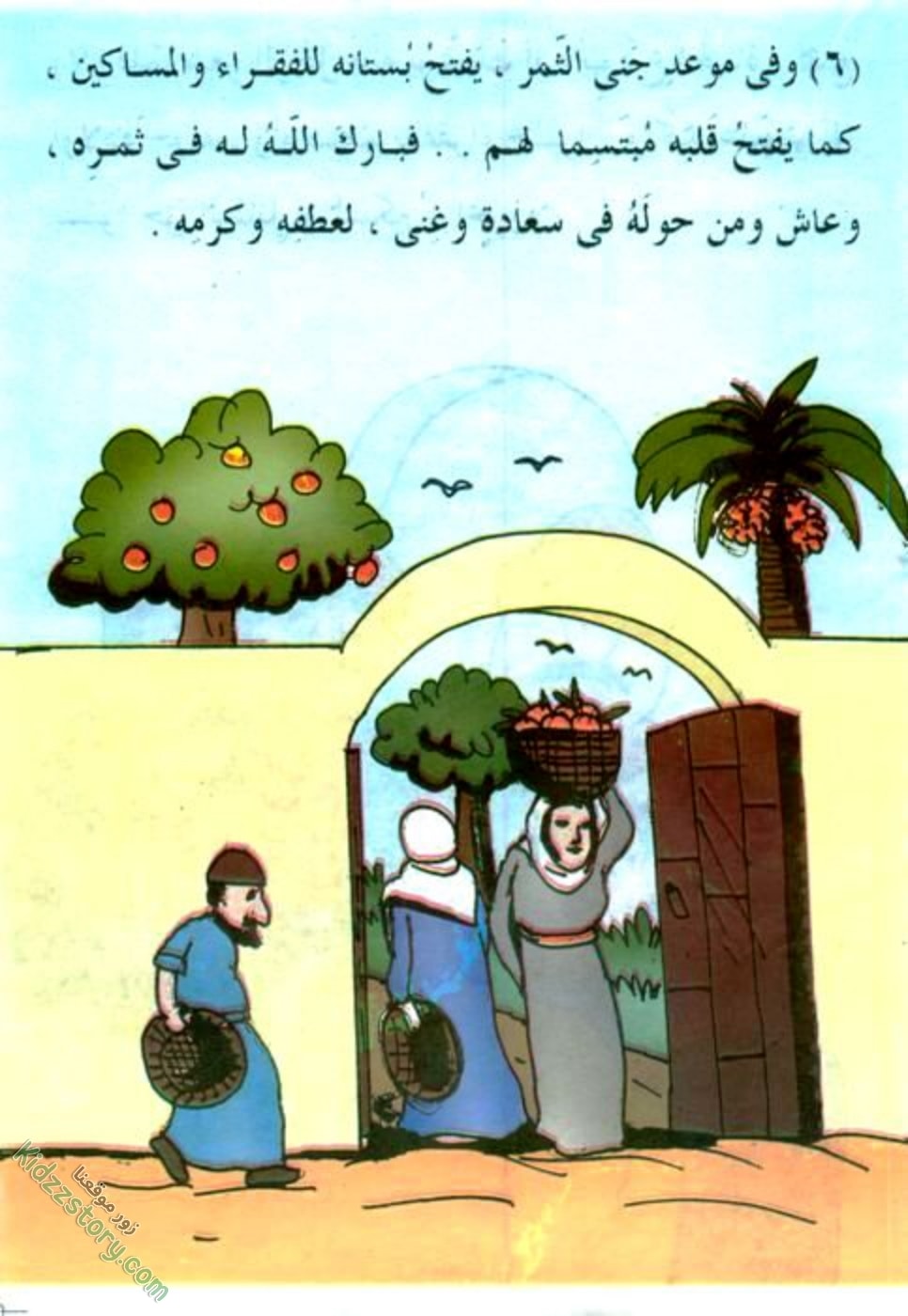 وفي موعد جني الثمر، يفتح بستانه للفقراء والمساكين. كما يفتح قلبه مبتسما لهم… فبارك الله له في ثمره، وعاش ومن حوله في سعادة وغنى، لعطفه وكرمه.