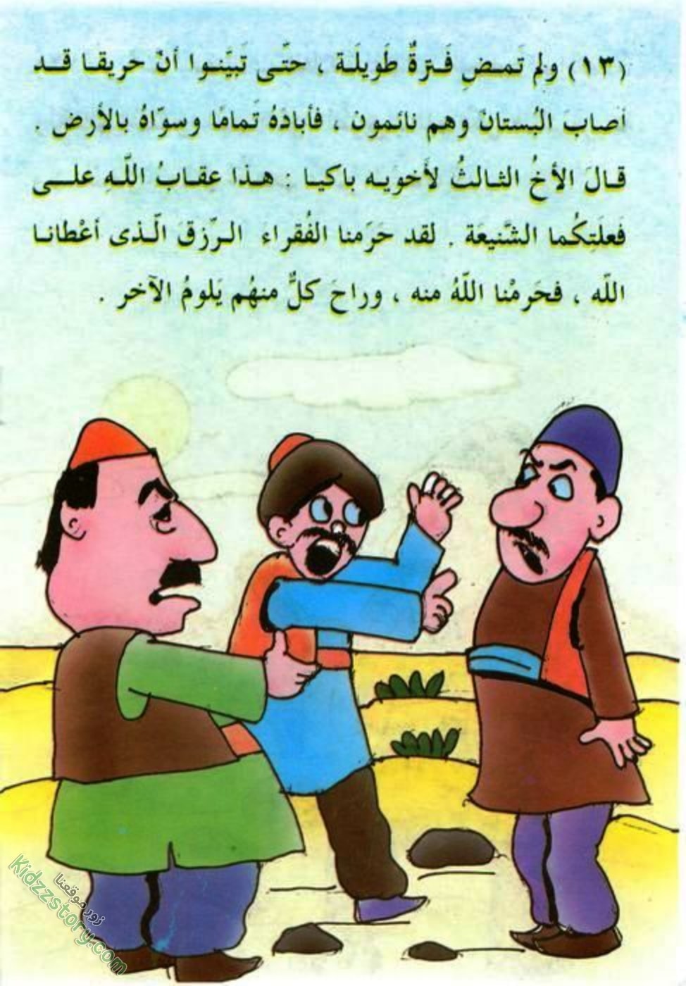 قال الأخ الثالث لأخويه باكيا: هذا عقاب الله على فعلتكما الشنيعة. لقد حرمنا الفقراء الرزق الذي أعطانا الله، فحرمنا الله منه، وراح كل منهم يلوم الآخر.