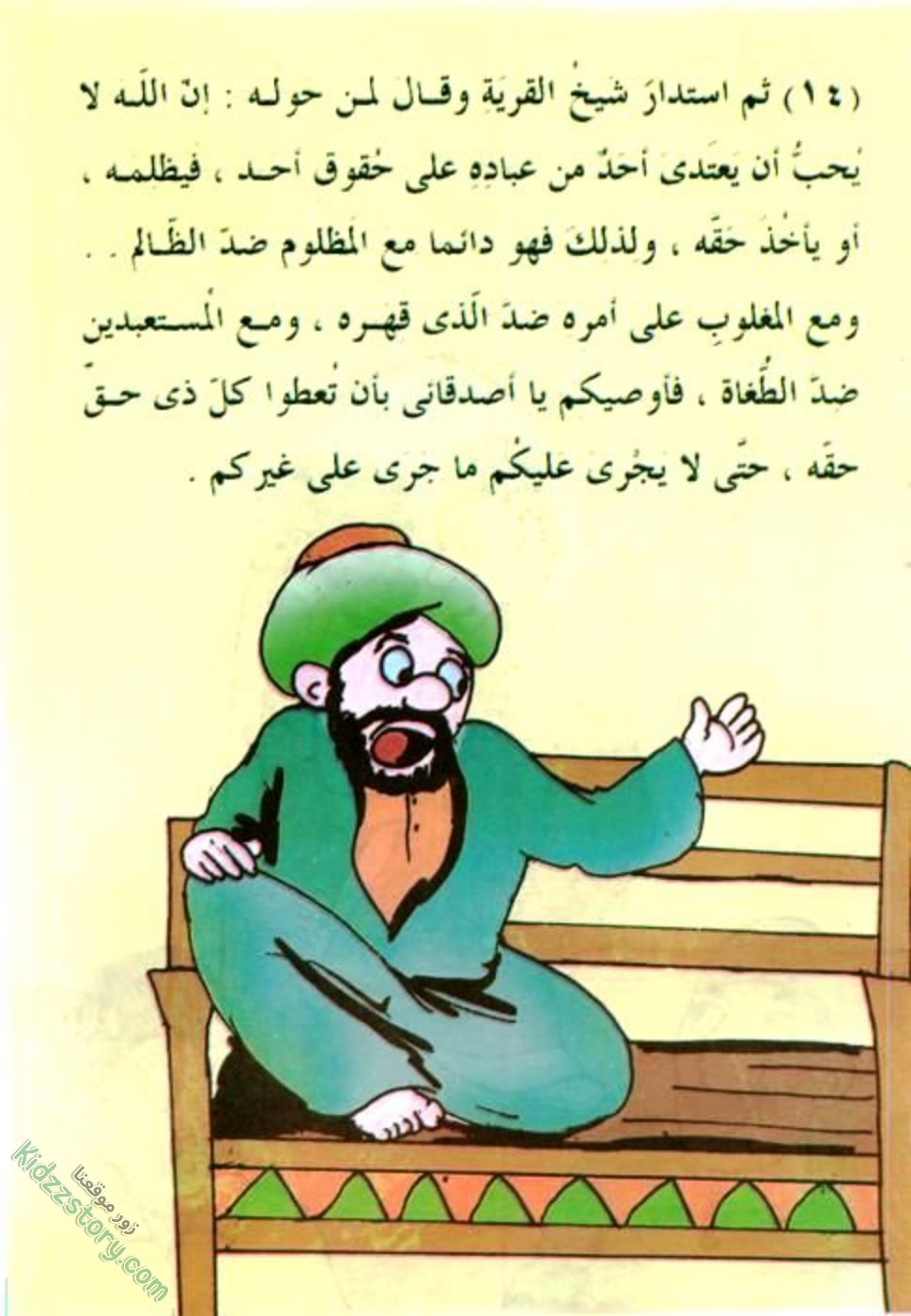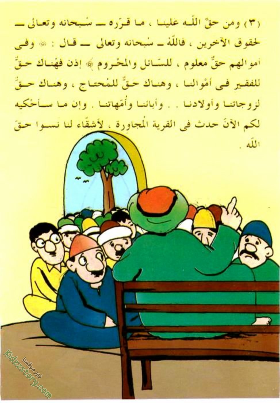 ثم استدار شيخ القرية وقال لمن حوله: إن الله لا يحب أن يعتدي أحد من عباده على حقوق أحد، فيظلمه أو يأخذ حقه، ولذلك فهو دائما مع المظلوم ضد الظالم، ومع المغلوب على أمره ضد الذي قهره، ومع المستضعفين ضد الطغاة، فأوصيكم يا أصدقائي بأن تعطوا كل ذي حق حقه، حتى لا يجري عليكم ما جرى على غيركم.