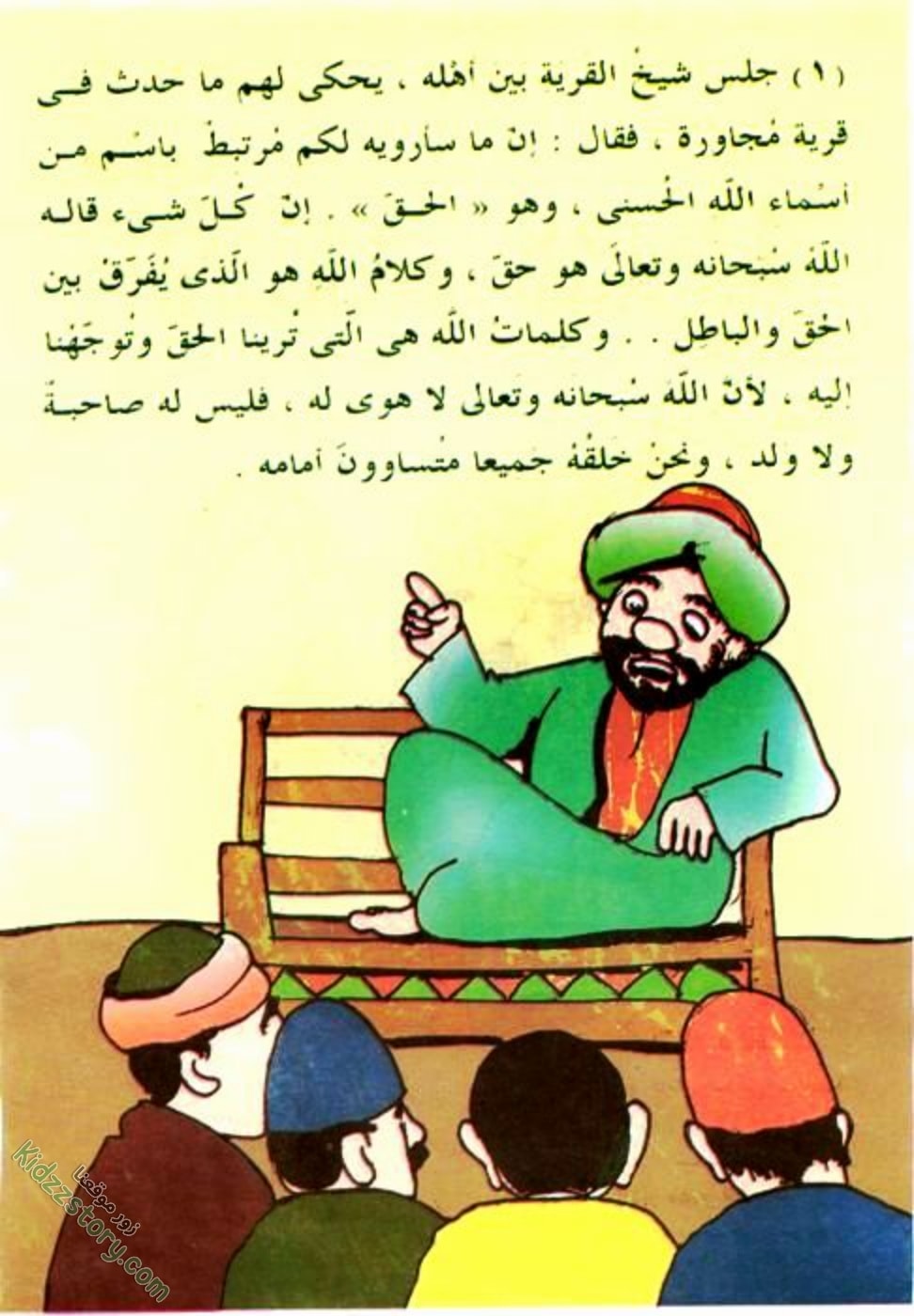 جلس شيخ القرية بين أهله، يحكي لهم ما حدث في قرية مجاورة، فقال: إن ما سأرويه لكم مرتبط باسم من أسماء الله الحسنى، وهو «الحق». إن كل شيء قاله الله سبحانه وتعالى هو حق، وكلام الله هو الذي يفرق بين الحق والباطل.. وكلمات الله هي التي ترينا الحق وتوجهنا إليه، لأن الله سبحانه وتعالى لا هوى له، فليس له صاحبة ولا ولد، ونحن خلقه جميعا متساوون أمامه.