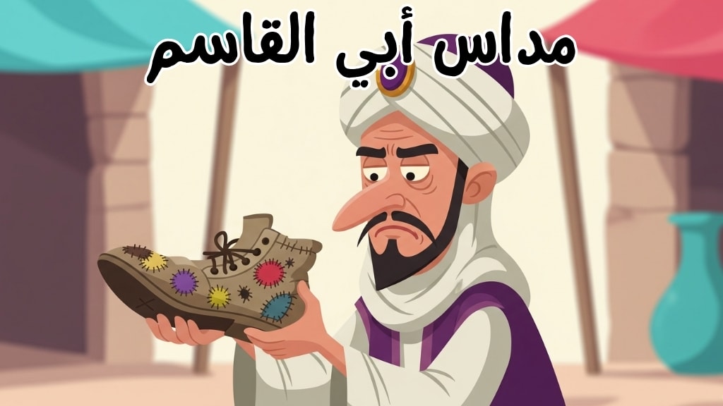 فأرسل القاضي رجاله فأتوا بأبي القاسم وبالمداس الجديد الذي أخذه، واتهمه القاضي بسرقة مداسه؛ لذلك أمر بضربه وحبسه.