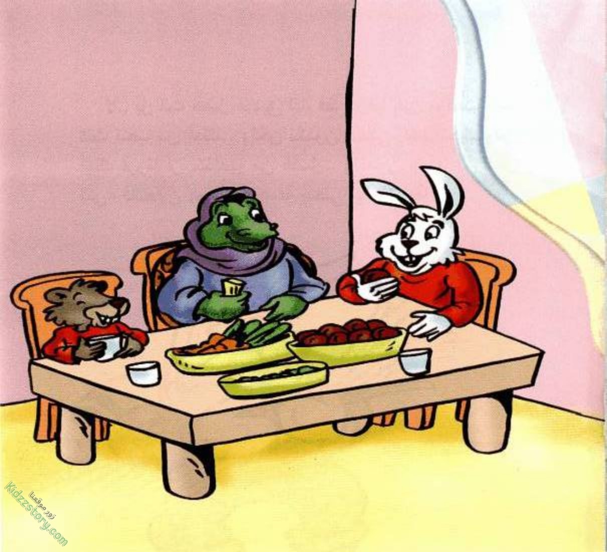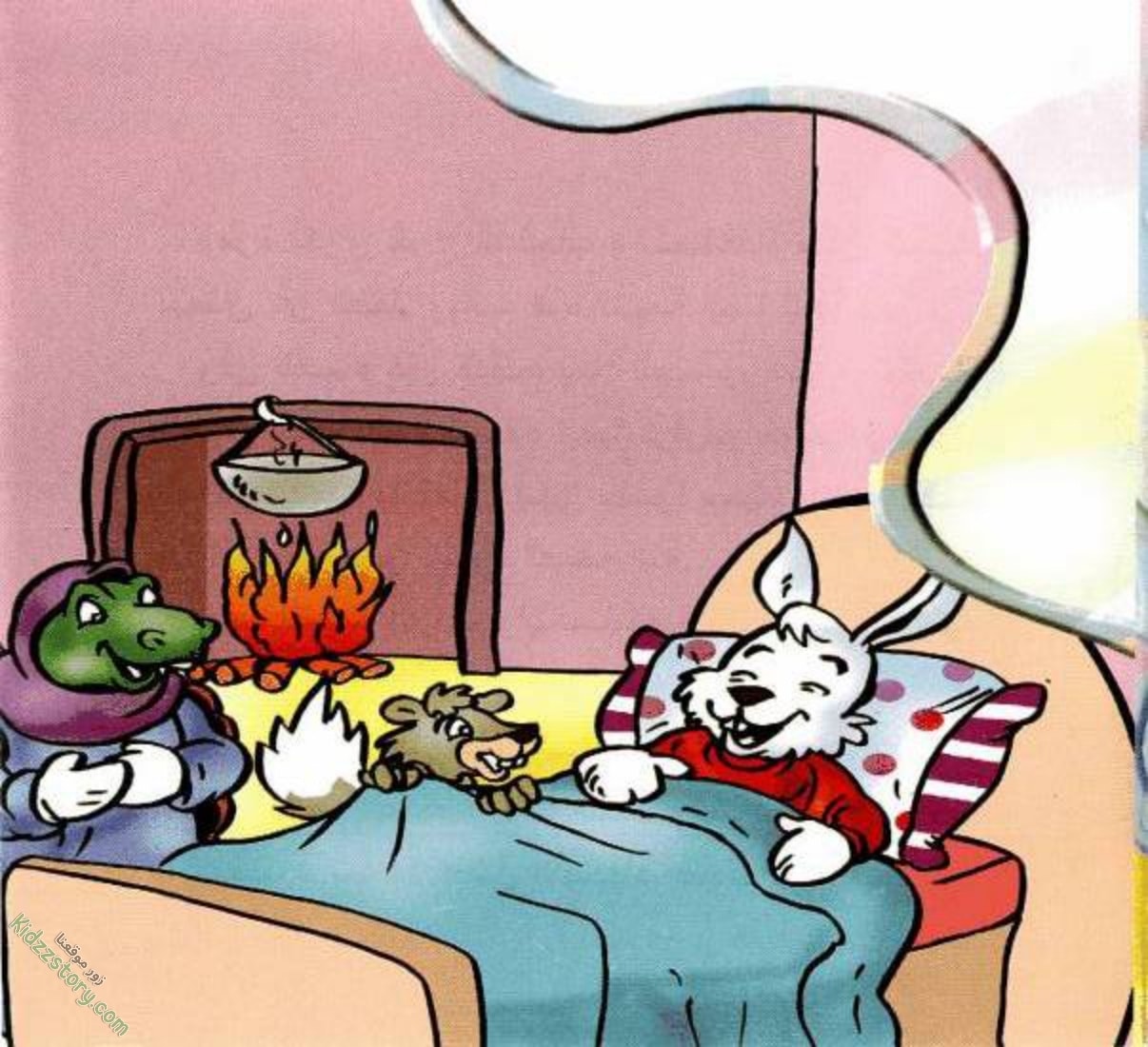 سرى الدفء في الغرفة أخيرا وشعر الأرنب ببعض الراحة وبدأ الألم يزول. فابتسمت له السلحفاة وقالت له: “شفاك الله يا صديقي العزيز. لقد علمنا اليوم فقط كم كنت تتعب من أجلنا وأنت تجلب لنا الحطب كل يوم. هيا أخبرني ماذا تحب أن تأكل؟”