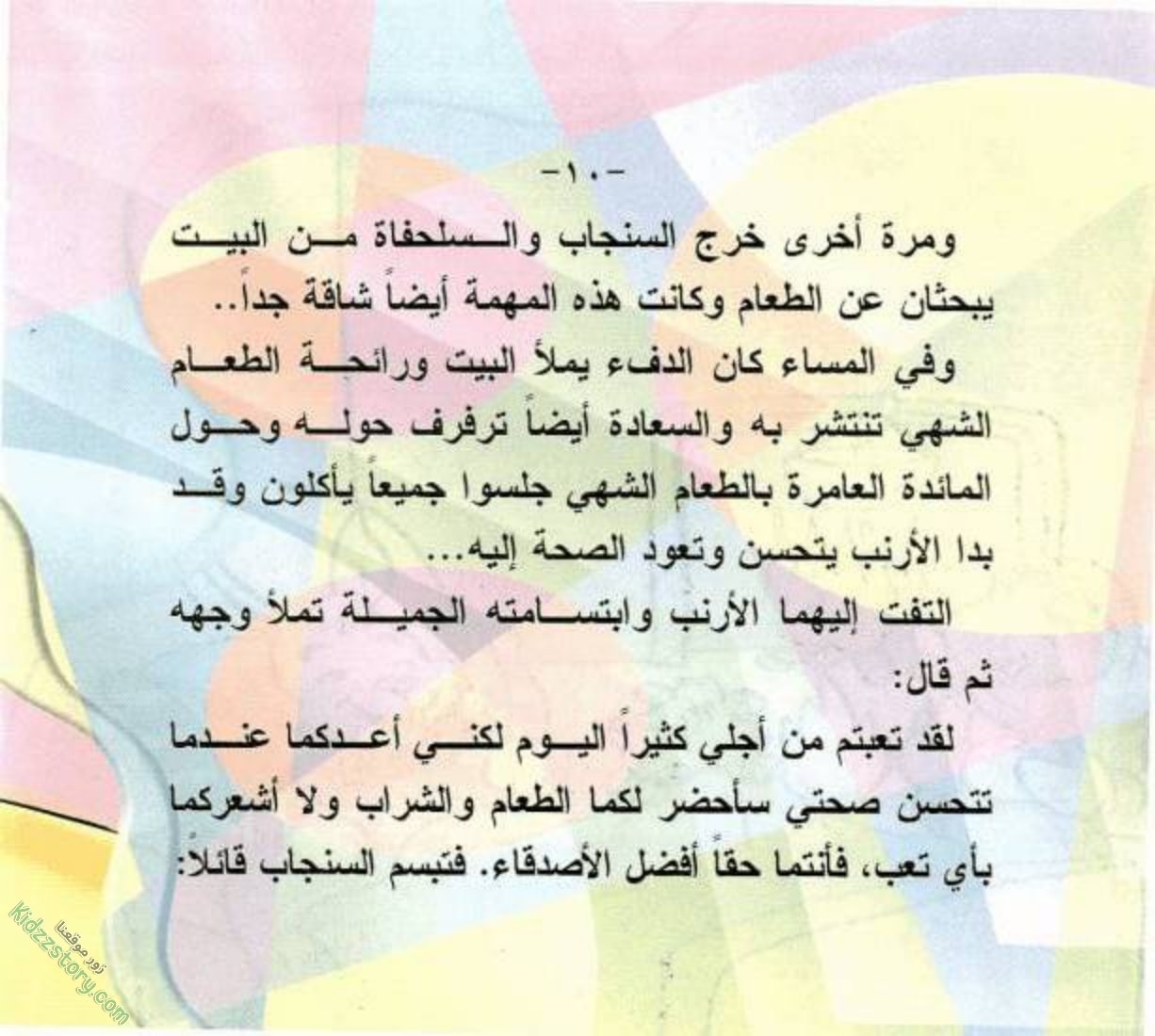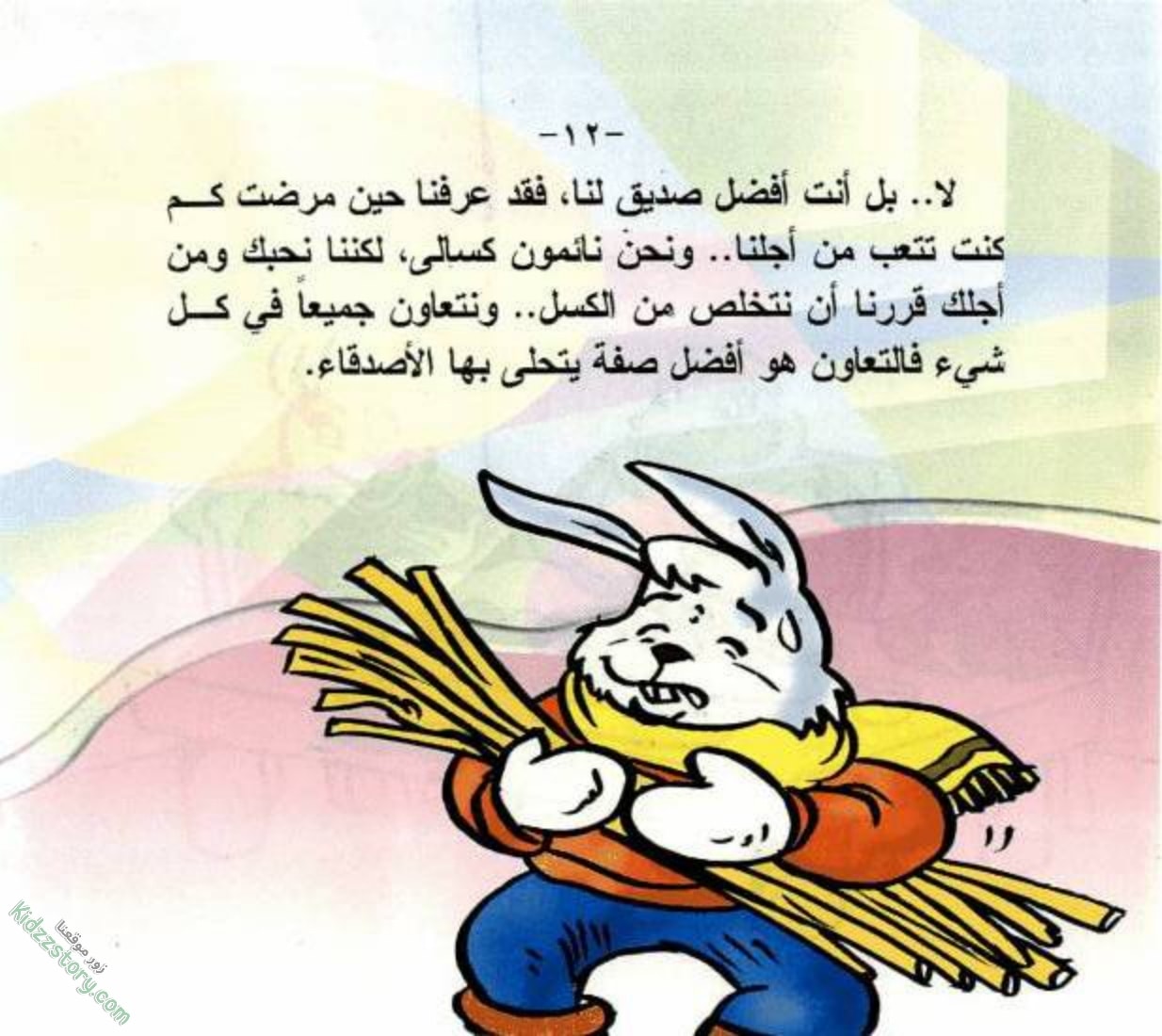 التفت إليهما الأرنب وابتسامته الجميلة تملأ وجهه ثم قال: “لقد تعبتما من أجلي كثيرا اليوم لكني أعدكما عندما تتحسن صحتي سأحضر لكما الطعام والشراب ولا أشعركما بأي تعب، فأنتما حقا أفضل الأصدقاء.”