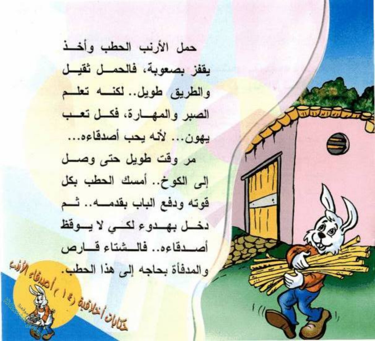 حمل الأرنب الحطب وأخذ يقفز بصعوبة، فالحمل ثقيل والطريق طويل لكنه تعلم الصبر والمهارة، فكل تعب يهون لأنه يحب أصدقاءه.
