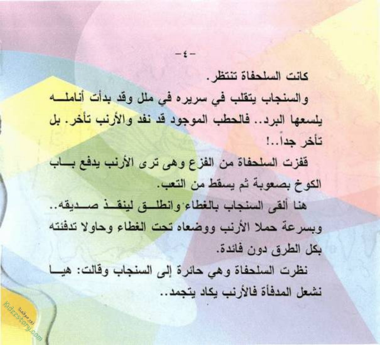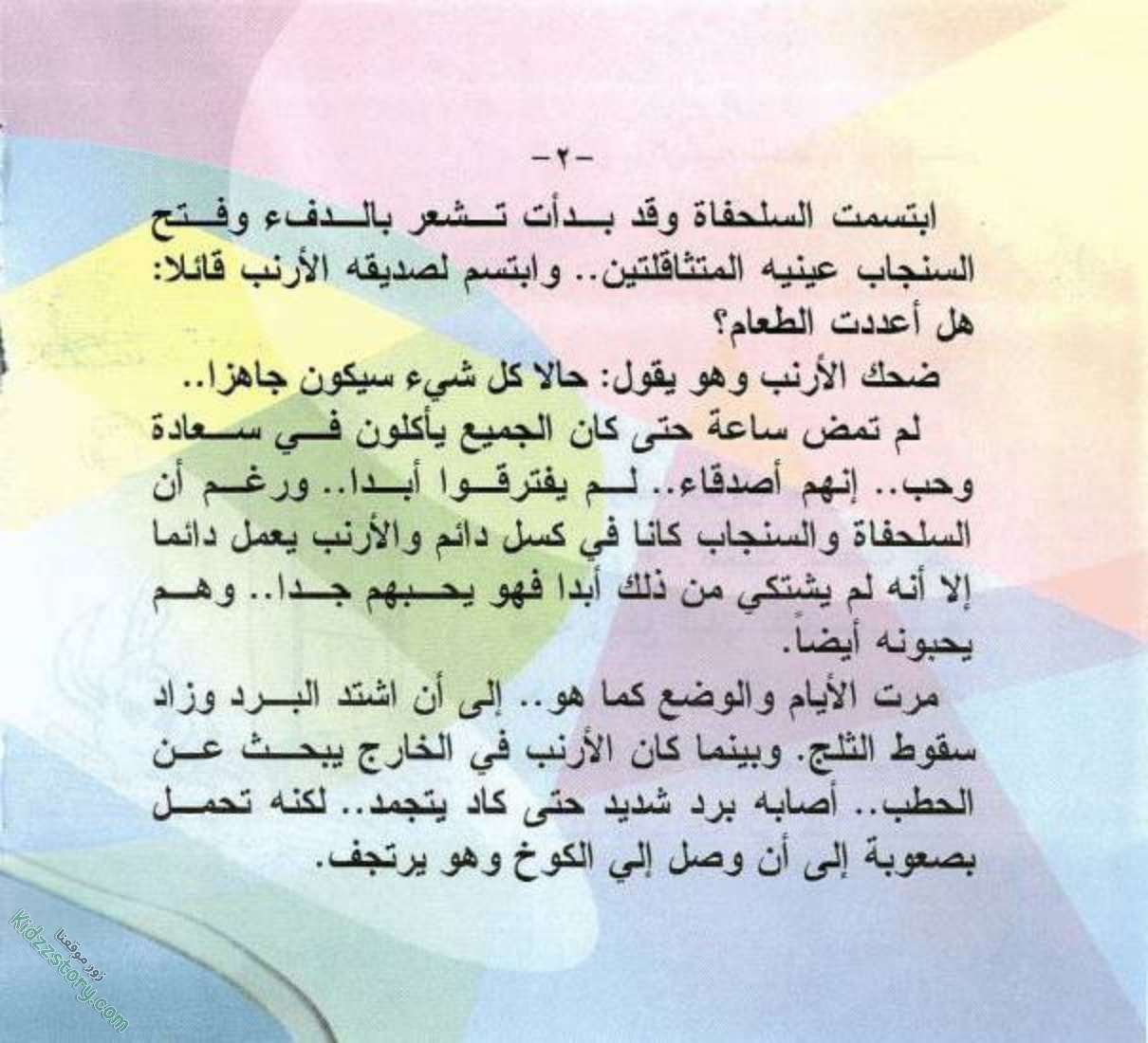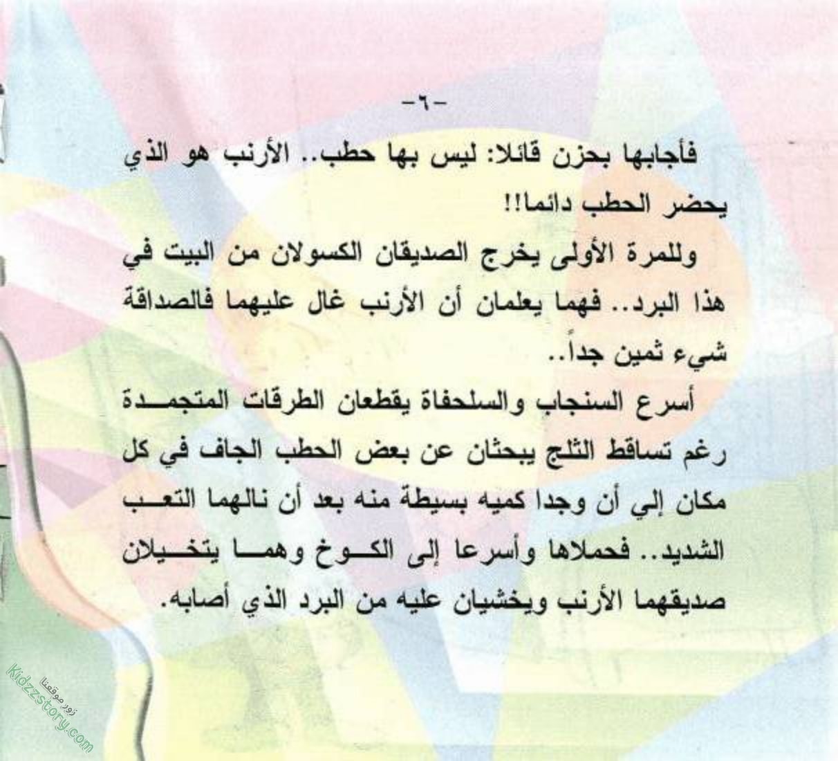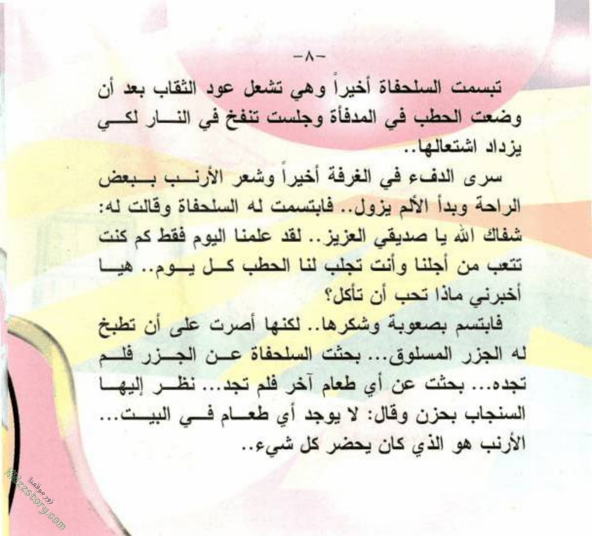 فأجابها بحزن قائلا: “ليس بها حطب.. الأرنب هو الذي يحضر الحطب دائما!!”