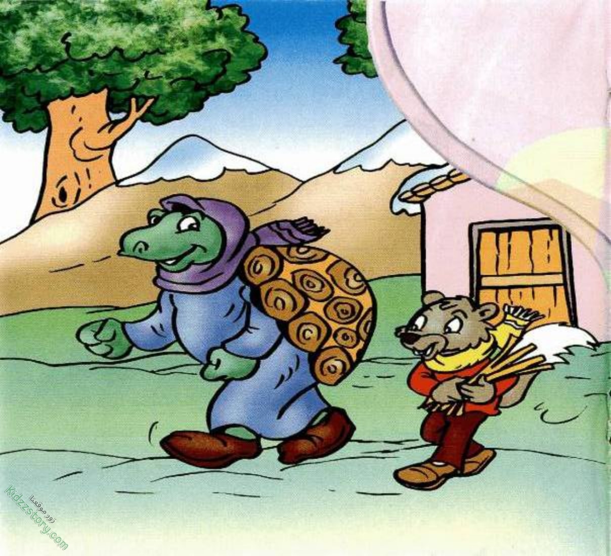 قفزت السلحفاة من الفزع وهي ترى الأرنب يدفع باب الكوخ بصعوبة ثم يسقط من التعب.