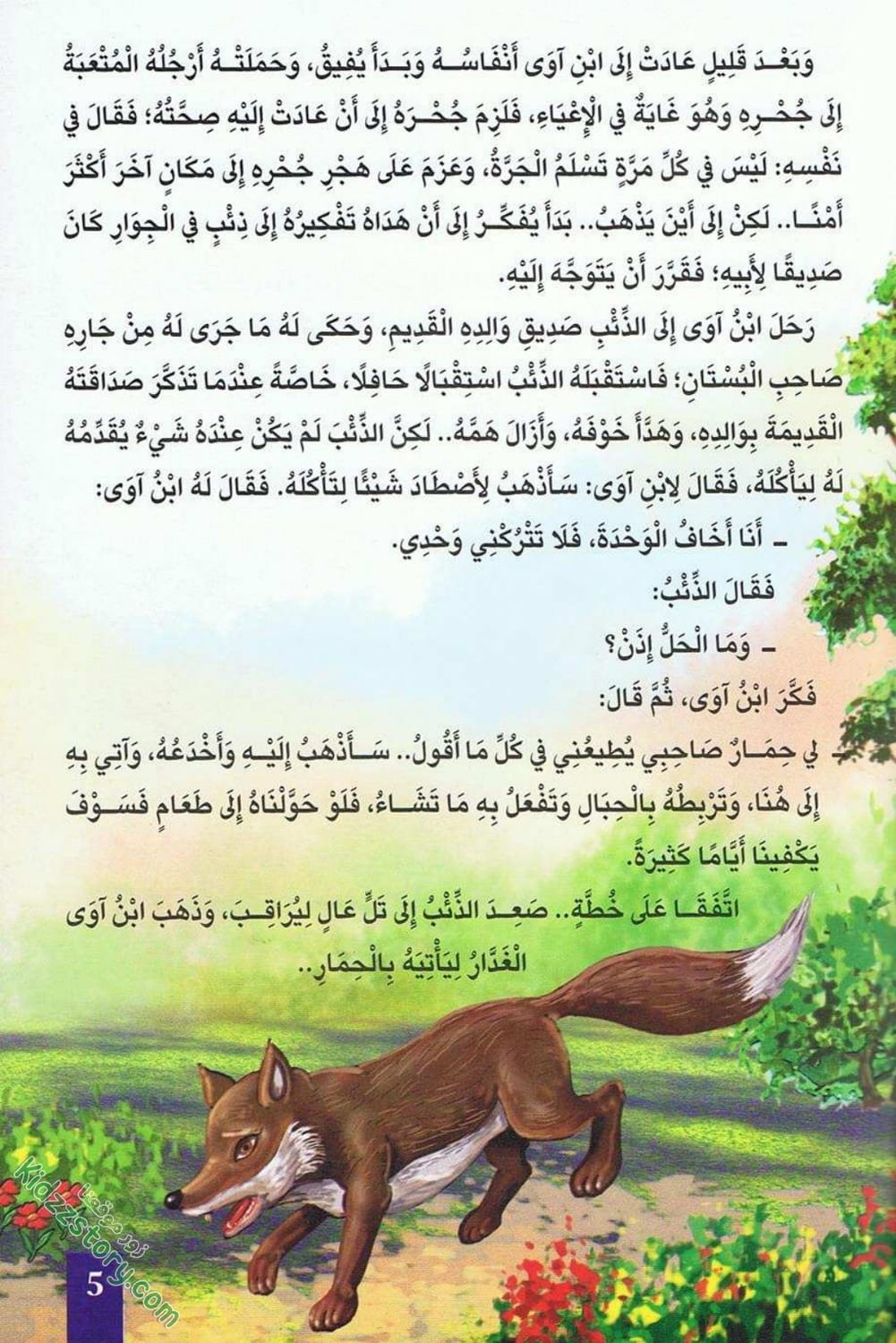 رحل ابن آوى إلى الذئب صديق والده القديم، وحكى له ما جرى له من جاره صاحب البستان، فاستقبله الذئب استقبالًا حافلًا، خاصة عندما تذكر صداقته القديمة بوالده، وهدأ خوفه، وأزال همه. لكن الذئب لم يكن عنده شيء يقدمه له ليأكله، فقال لابن آوى: سأذهب لأصطاد شيئًا لتأكله.