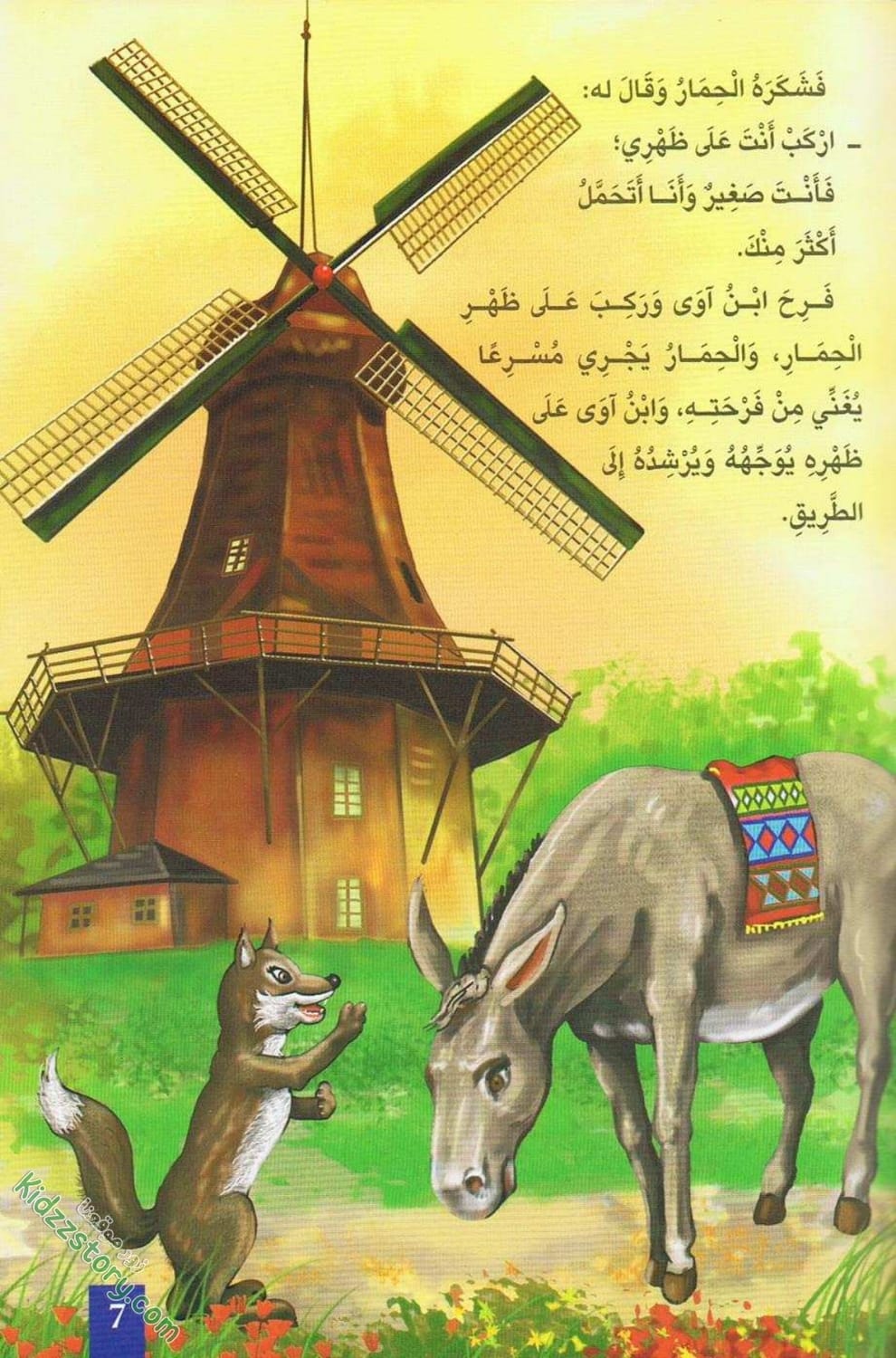 ذهب ابن آوى وانتهى به الطريق إلى طاحونة في مرج صغير يقف فيه حمار يشعر بالبؤس والامتهان من شدة الحمل والعمل. سلم عليه ابن آوى، وسأله عن الأحوال، فرد عليه الحمار في أسف أن الأحوال لا تسر من شدة التعب، ومن المعاملة السيئة التي يلقاها من أصحاب العمل، وشدة الإهانة التي يتلقاها.