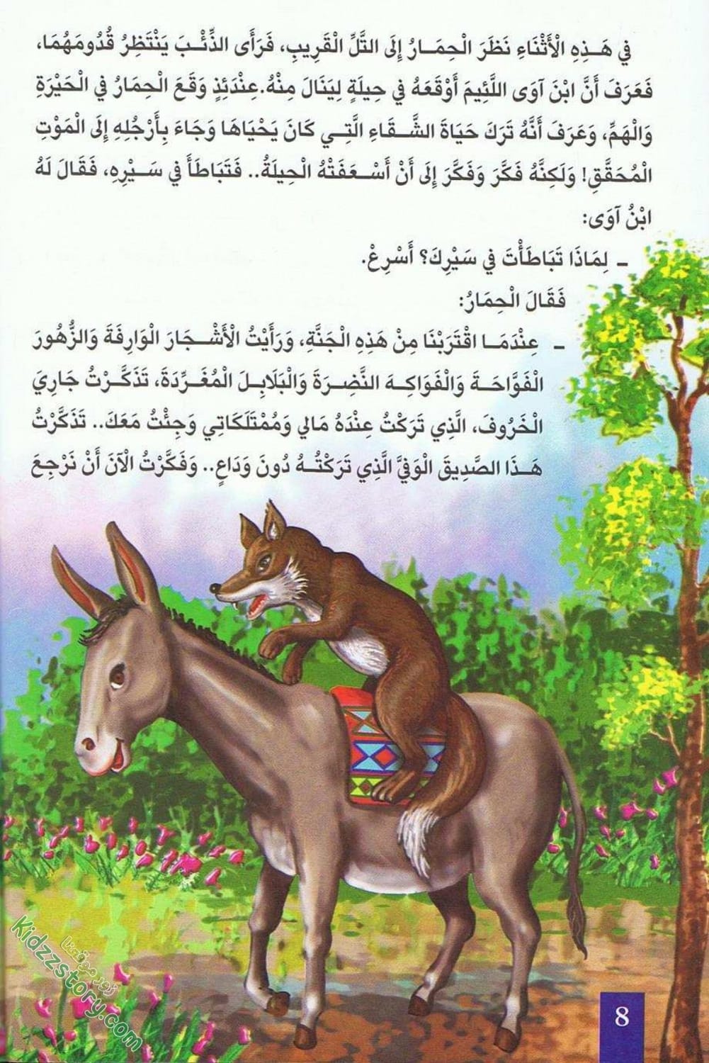 وبعد قليل عادت إلى ابن آوى أنفاسه وبدأ يفيق، وحملته أرجله المتعبة إلى جحره وهو غاية في الإعياء، فلزم جحره إلى أن عادت إليه صحته. فقال في نفسه: ليس في كل مرة تسلم الجرة، وعزم على هجر جحره إلى مكان آخر أكثر أمنًا. لكن إلى أين يذهب؟ بدأ يفكر إلى أن هداه تفكيره إلى ذئب في الجوار كان صديقًا لأبيه؛ فقرر أن يتوجه إليه.