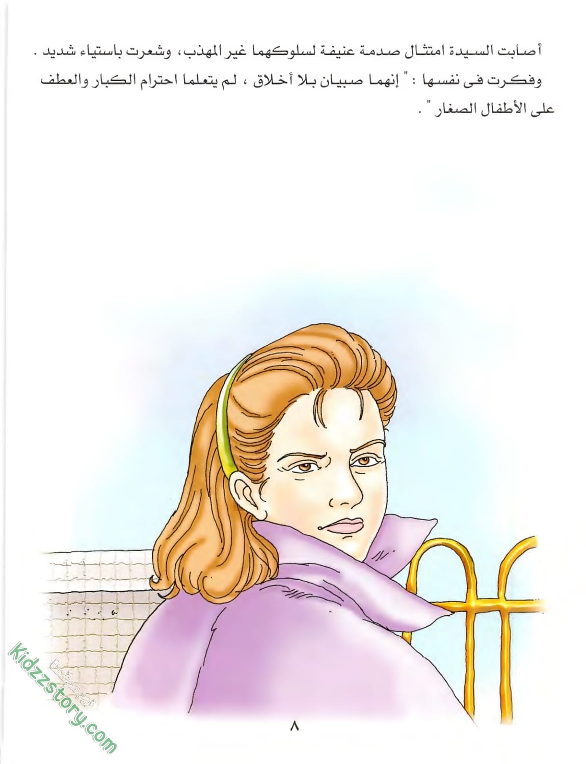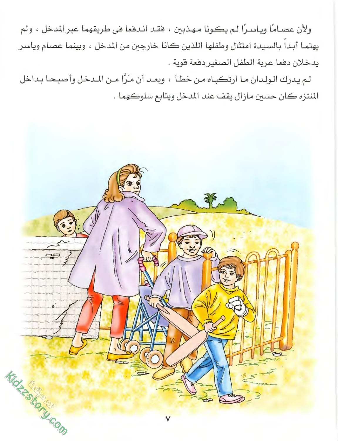 لكن الأولاد لم يسمعوها؛ فهم كانوا مشغولين بالكلام. ولأن عصام وياسر لم يكونا مهذبين، فقد اندفعا في طريقهما عبر المدخل، ولم يهتما أبدًا بالسيدة امتثال وطفلها اللذين كانا خارجين من المدخل، وبينما عصام وياسر يدخلان دفعا عربة الطفل الصغير دفعة قوية.
