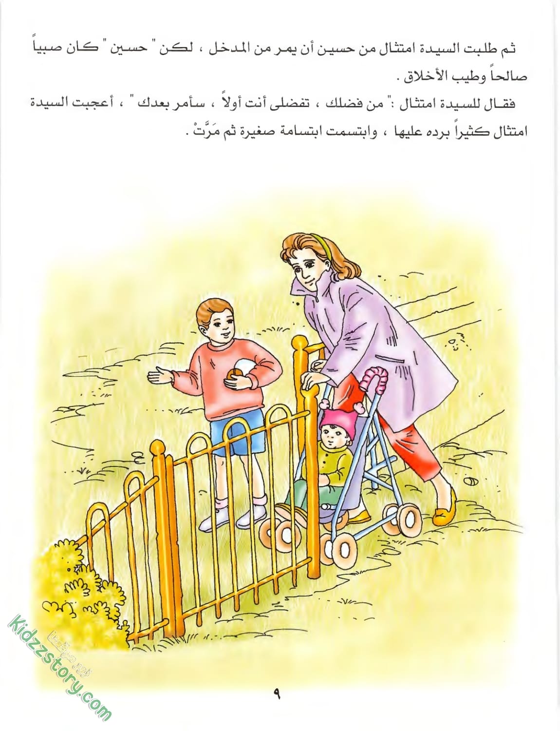 ثم طلبت السيدة امتثال من حسين أن يمر من المدخل، لكن حسين كان صبيًا صالحًا وطيب الأخلاق.