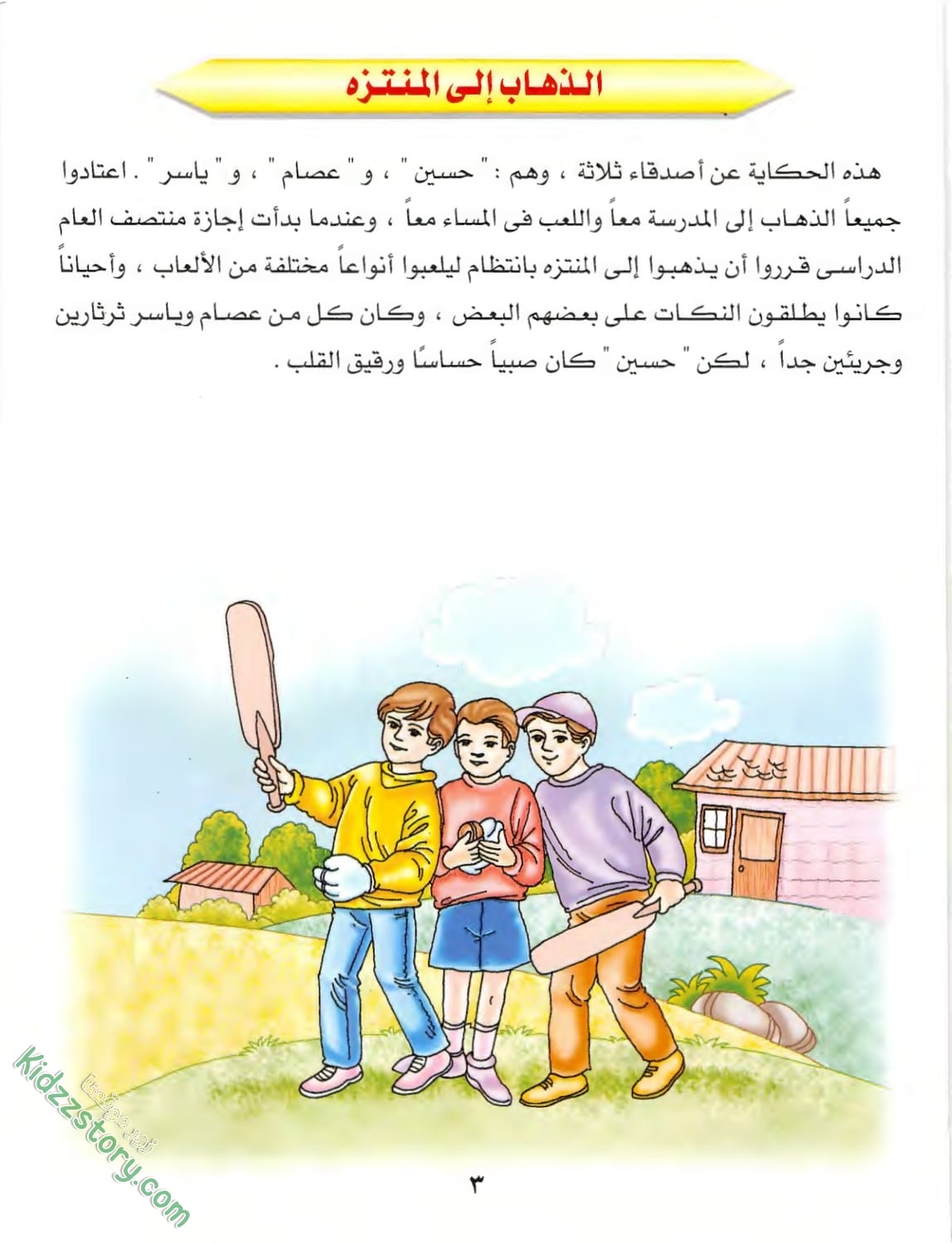 هذه الحكاية عن أصدقاء ثلاثة، وهم: حسين، وعصام، وياسر. اعتادوا جميعًا الذهاب إلى المدرسة معًا واللعب في المساء معًا، وعندما بدأت إجازة منتصف العام الدراسي قرروا أن يذهبوا إلى المنتزه بانتظام ليلعبوا أنواعًا مختلفة من الألعاب، وأحيانًا كانوا يطلقون النكات على بعضهم البعض، وكان كل من عصام وياسر ثرثارين وجريئين جدًا، لكن حسين كان صبيًا حساسًا ورقيق القلب.