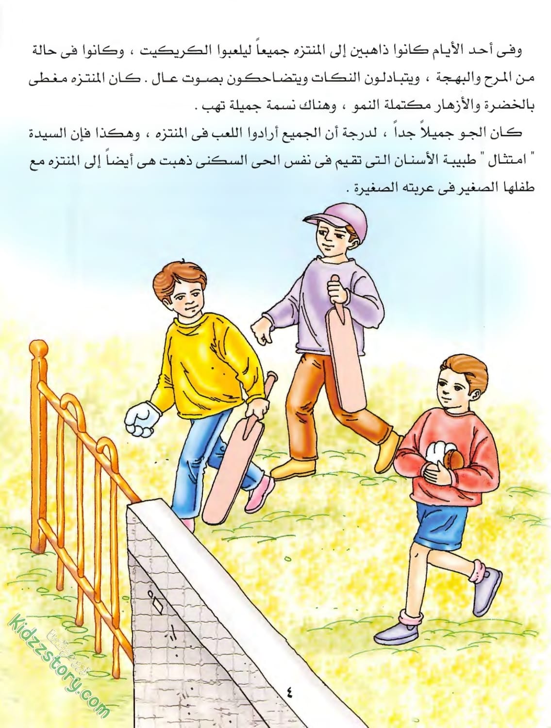 وفي أحد الأيام كانوا ذاهبين إلى المنتزه جميعًا ليلعبوا الكريكيت، وكانوا في حالة من المرح والبهجة، ويتبادلون النكات ويتضاحكون بصوت عالٍ. كان المنتزه مغطى بالخضرة والأزهار مكتملة النمو، وهناك نسمة جميلة تهب. وكان الجو جميلًا جدًا، لدرجة أن الجميع أرادوا اللعب في المنتزه، وهكذا فإن السيدة امتثال طبيبة الأسنان التي تقيم في نفس الحي السكني ذهبت هي أيضًا إلى المنتزه مع طفلها الصغير في عربته الصغيرة.