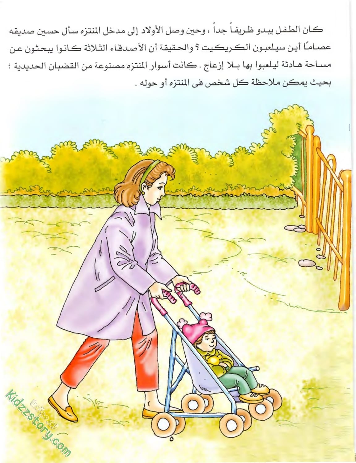 كان الطفل يبدو ظريفًا جدًا، وحين وصل الأولاد إلى مدخل المنتزه سأل حسين صديقه عصام أين سيلعبون الكريكيت؟ والحقيقة أن الأصدقاء الثلاثة كانوا يبحثون عن مساحة هادئة ليلعبوا بها بلا إزعاج. كانت أسوار المنتزه مصنوعة من القضبان الحديدية؛ بحيث يمكن ملاحظة كل شخص في المنتزه أو حوله.