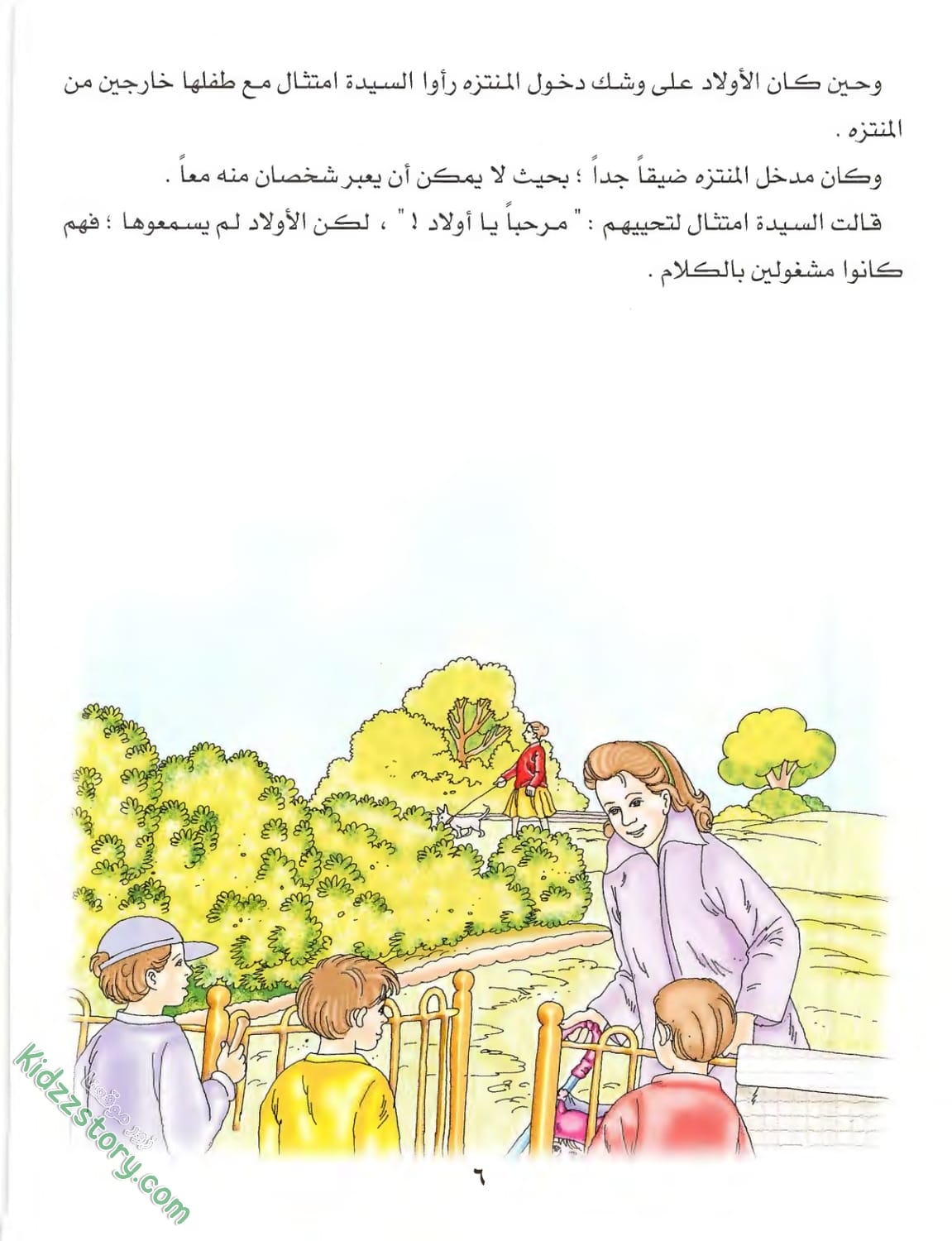 وحين كان الأولاد على وشك دخول المنتزه رأوا السيدة امتثال مع طفلها خارجين من المنتزه.