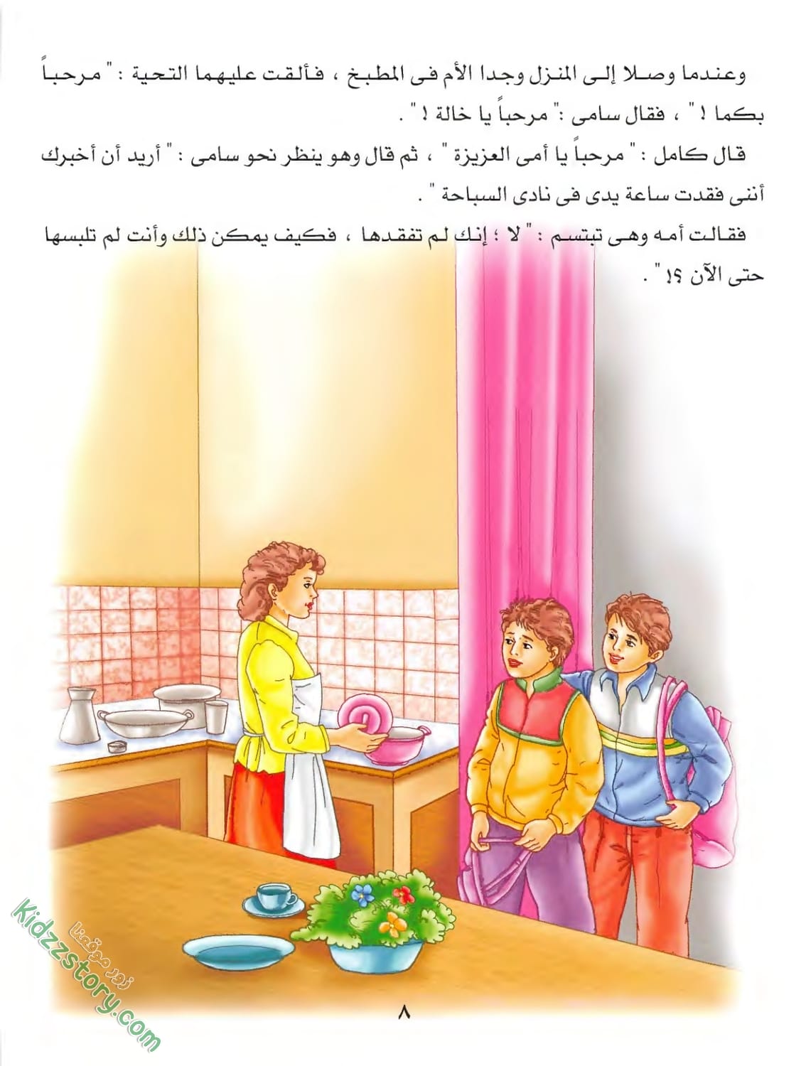 قال كامل: “مرحباً يا أمي العزيزة”، ثم قال وهو ينظر نحو سامي: “أريد أن أخبرك أنني فقدت ساعة يدي في نادي السباحة”.