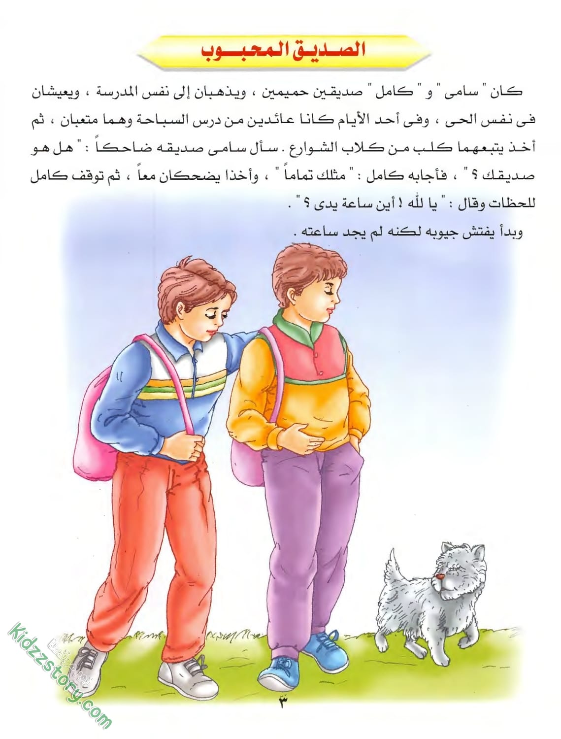 كان “سامي” و”كامل” صديقين حميمين، ويذهبان إلى نفس المدرسة، ويعيشان في نفس الحي. وفي أحد الأيام كانا عائدين من درس السباحة وهما متعبان، ثم أخذ يتبعهما كلب من كلاب الشوارع. سأل سامي صديقه ضاحكاً: “هل هو صديقك؟”، فأجابه كامل: “مثلك تماماً”، وأخذا يضحكان معاً، ثم توقف كامل للحظات وقال: “يا لله! أين ساعة يدي؟”.