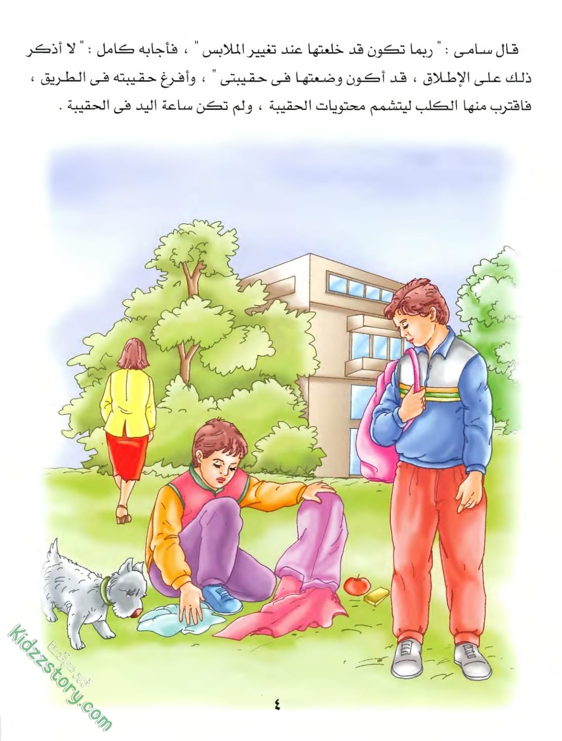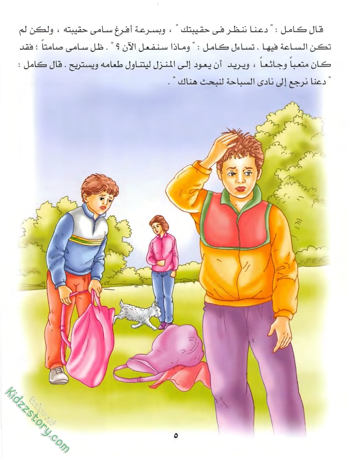 قال كامل: “دعنا ننظر في حقيبتك”، وبسرعة أفرغ سامي حقيبته، ولكن لم تكن الساعة فيها. تساءل كامل: “وماذا سنفعل الآن؟”. ظل سامي صامتاً؛ فقد كان متعباً وجائعاً، ويريد أن يعود إلى المنزل ليتناول طعامه ويستريح. قال كامل: “دعنا نرجع إلى نادي السباحة لنبحث هناك”.