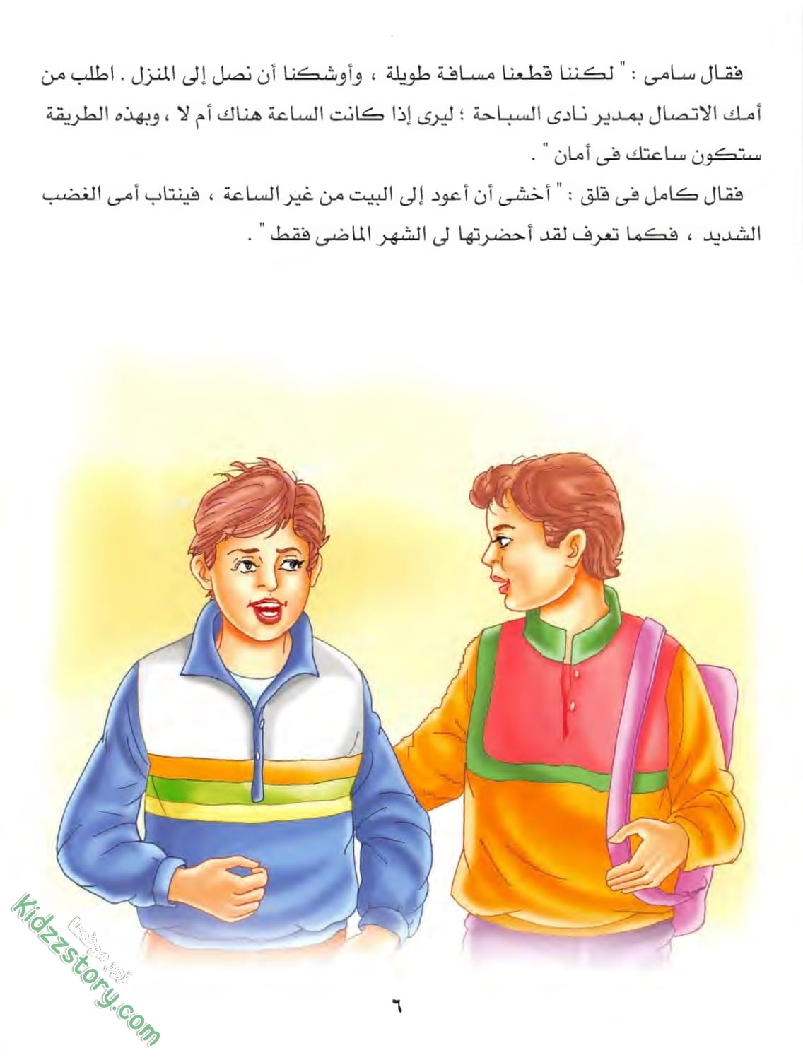فقال كامل في قلق: “أخشى أن أعود إلى البيت من غير الساعة، فينتاب أمي الغضب الشديد، فكما تعرف لقد أحضرتها لي الشهر الماضي فقط”.