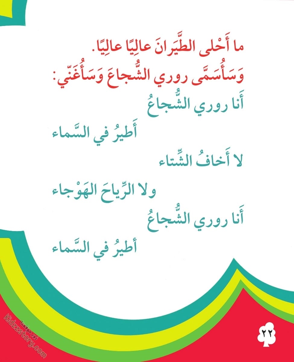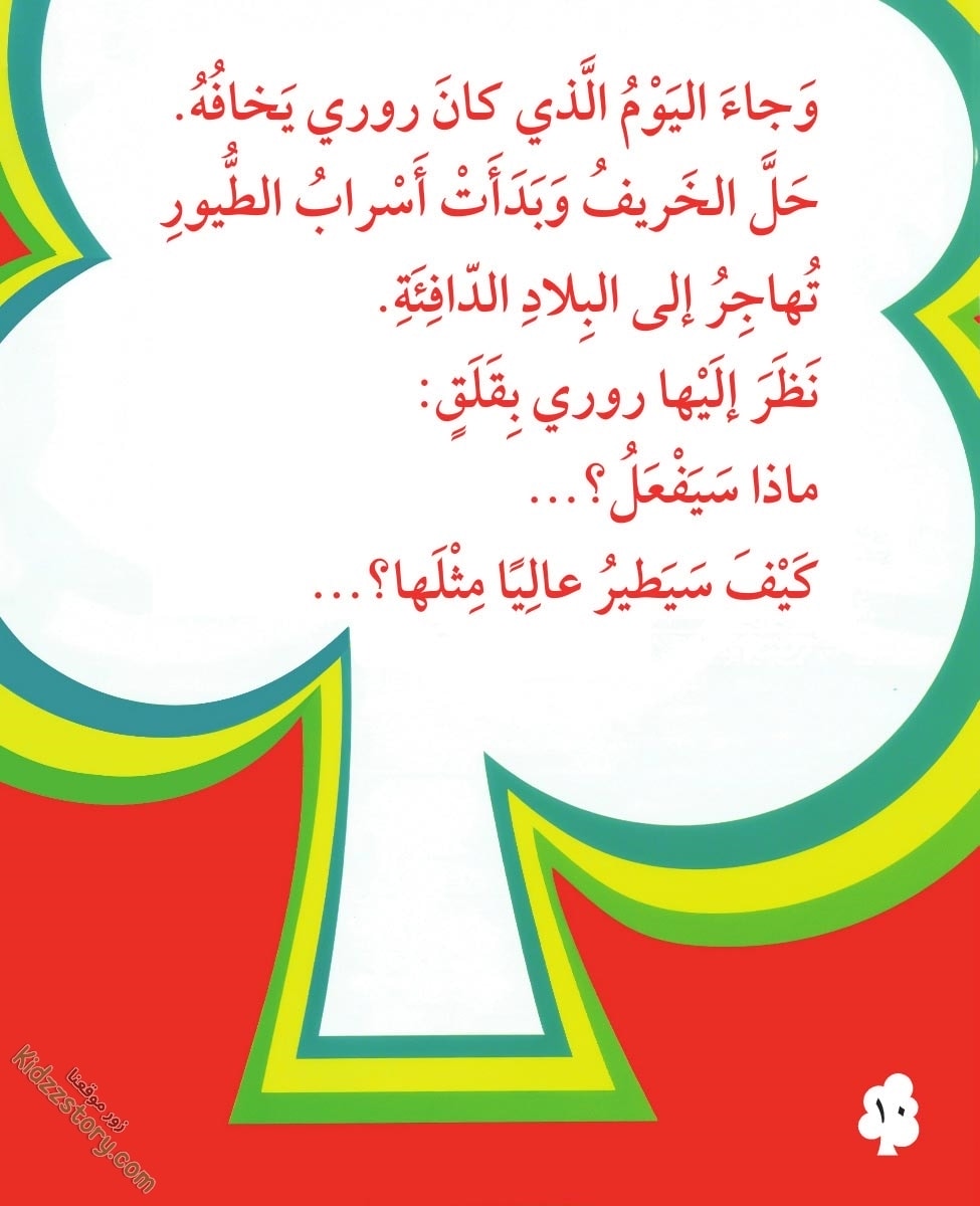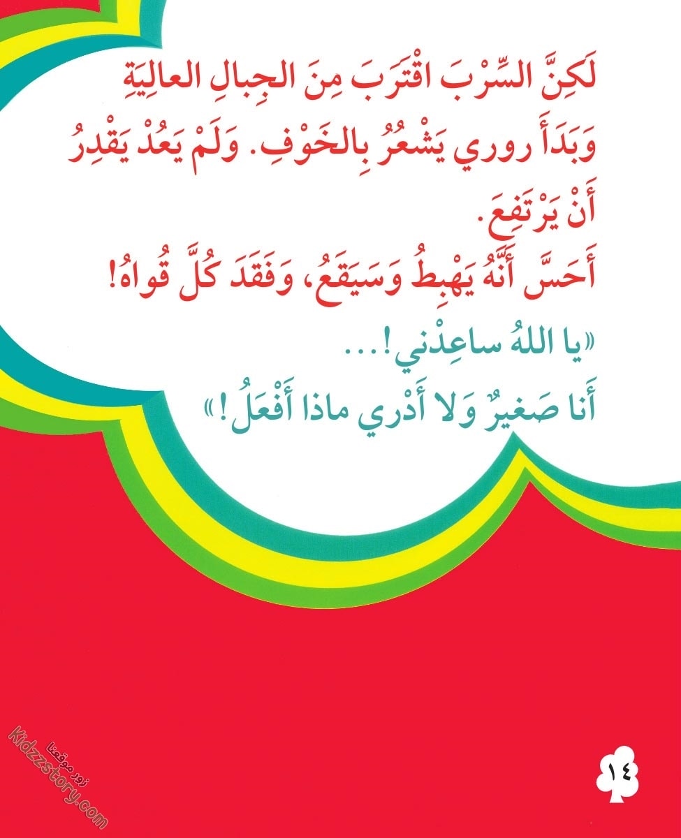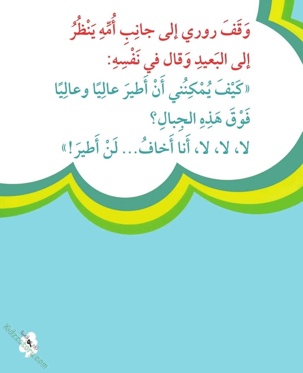 وقف روري إلى جانب أمه ينظر إلى البعيد وقال في نفسه: «كيف يمكنني أن أطير عاليًا وفوق هذه الجبال؟ لا، لا، لا، أنا أخاف… لن أطير!» وجاء اليوم الذي كان روري يخافه. حل الخريف وبدأت أسراب الطيور تهاجر إلى البلاد الدافئة. نظر إليها روري بقلق: «ماذا سيفعل؟ كيف سيطير عاليًا مثلها؟»