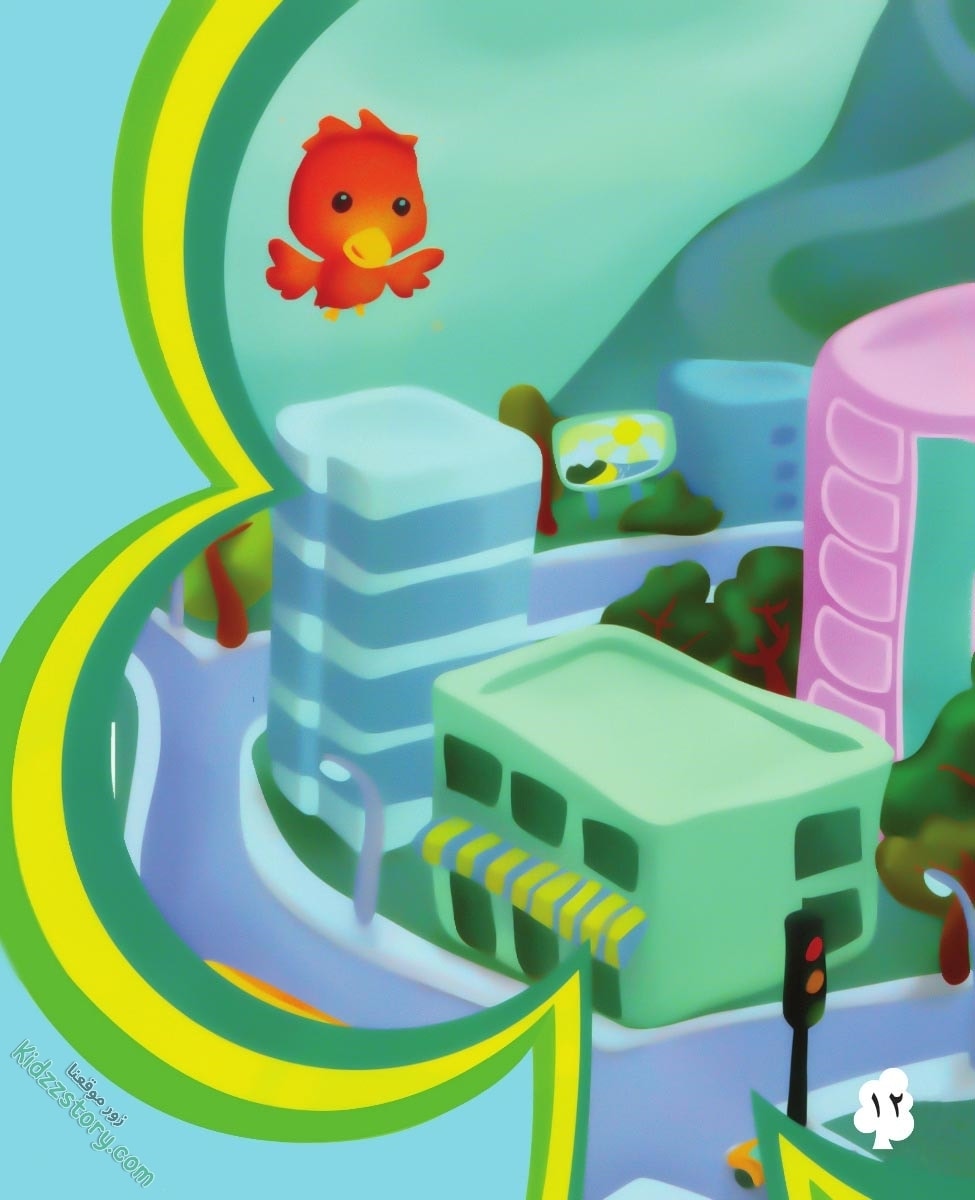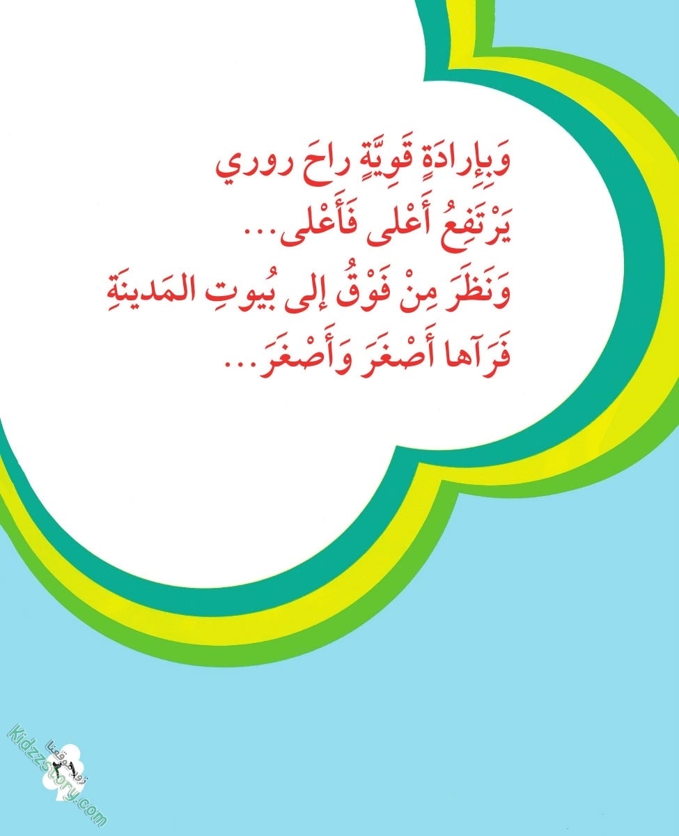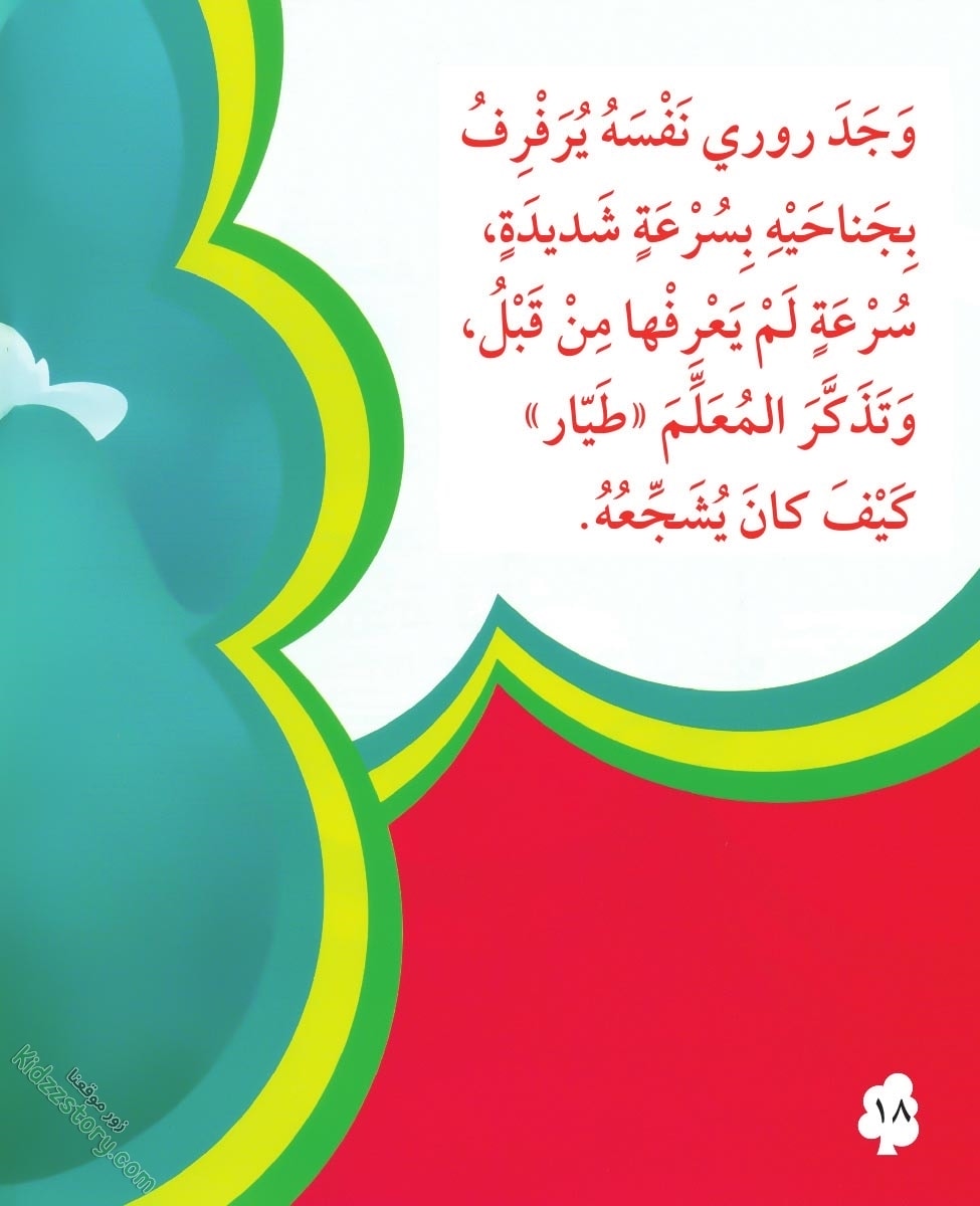 وجد روري نفسه يرفرف بجناحيه بسرعة شديدة، سرعة لم يعرفها من قبل، وتذكر المعلم «طيّار» وكيف كان يشجعه. وبإرادة قوية، راح روري يرتفع أعلى فأعلى… ونظر من فوق إلى بيوت المدينة فرآها أصغر وأصغر.