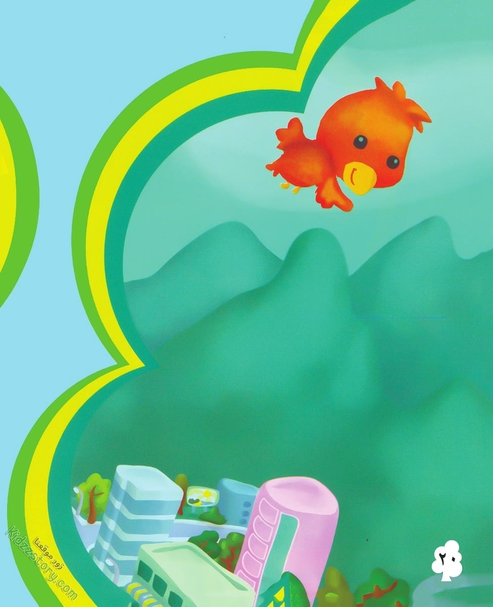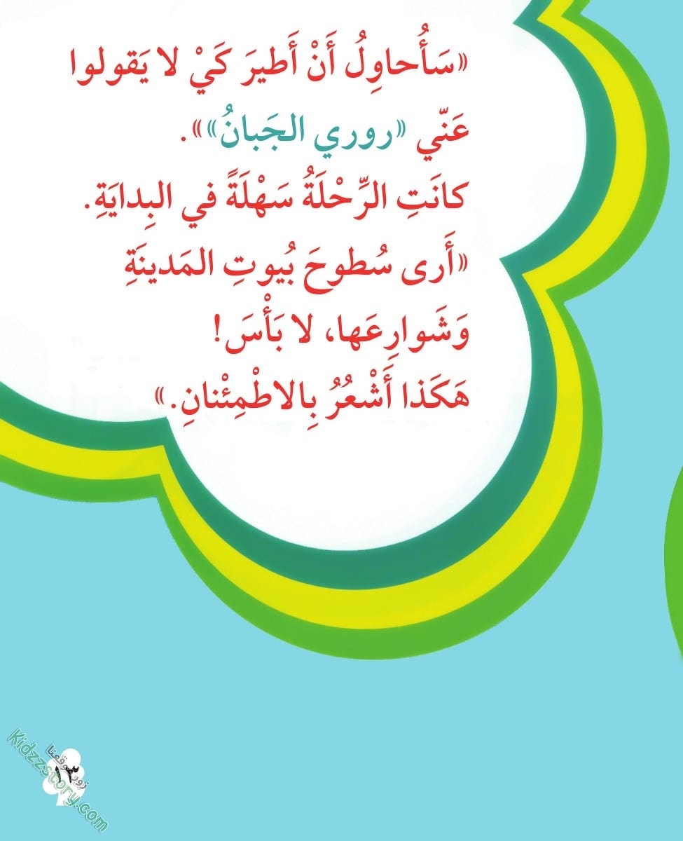 قال في نفسه: «سأحاول أن أطير كي لا يقولوا عني روري الجبان.» كانت الرحلة سهلة في البداية. قال في نفسه: «أرى سطوح بيوت المدينة وشوارعها، لا بأس! هكذا أشعر بالاطمئنان.» لكن السرب اقترب من الجبال العالية وبدأ روري يشعر بالخوف. ولم يعد يقدر أن يرتفع. أحس أنه يهبط وسيقع، وفقد كل قواه!