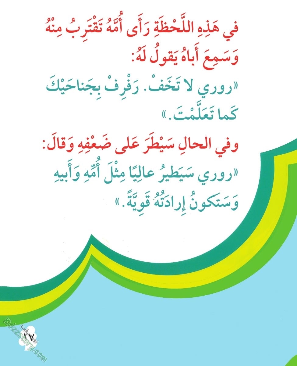 في هذه اللحظة، رأى أمه تقترب منه وسمع أباه يقول له: «روري لا تخف، رفرف بجناحيك كما تعلمت.» وفي الحال، سيطر على ضعفه وقال في نفسه: «روري سيطير عاليًا مثل أمه وأبيه وستكون إرادته قوية.»