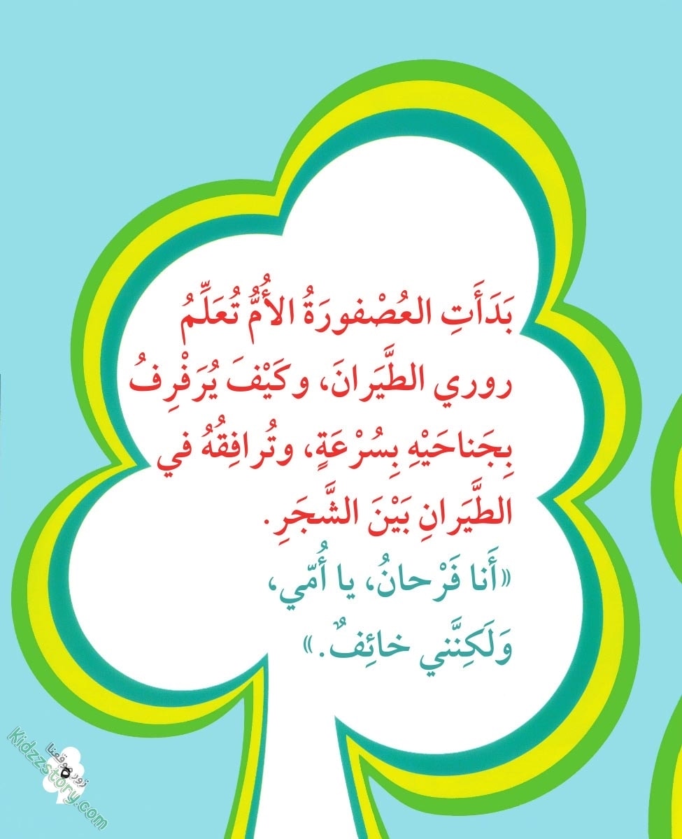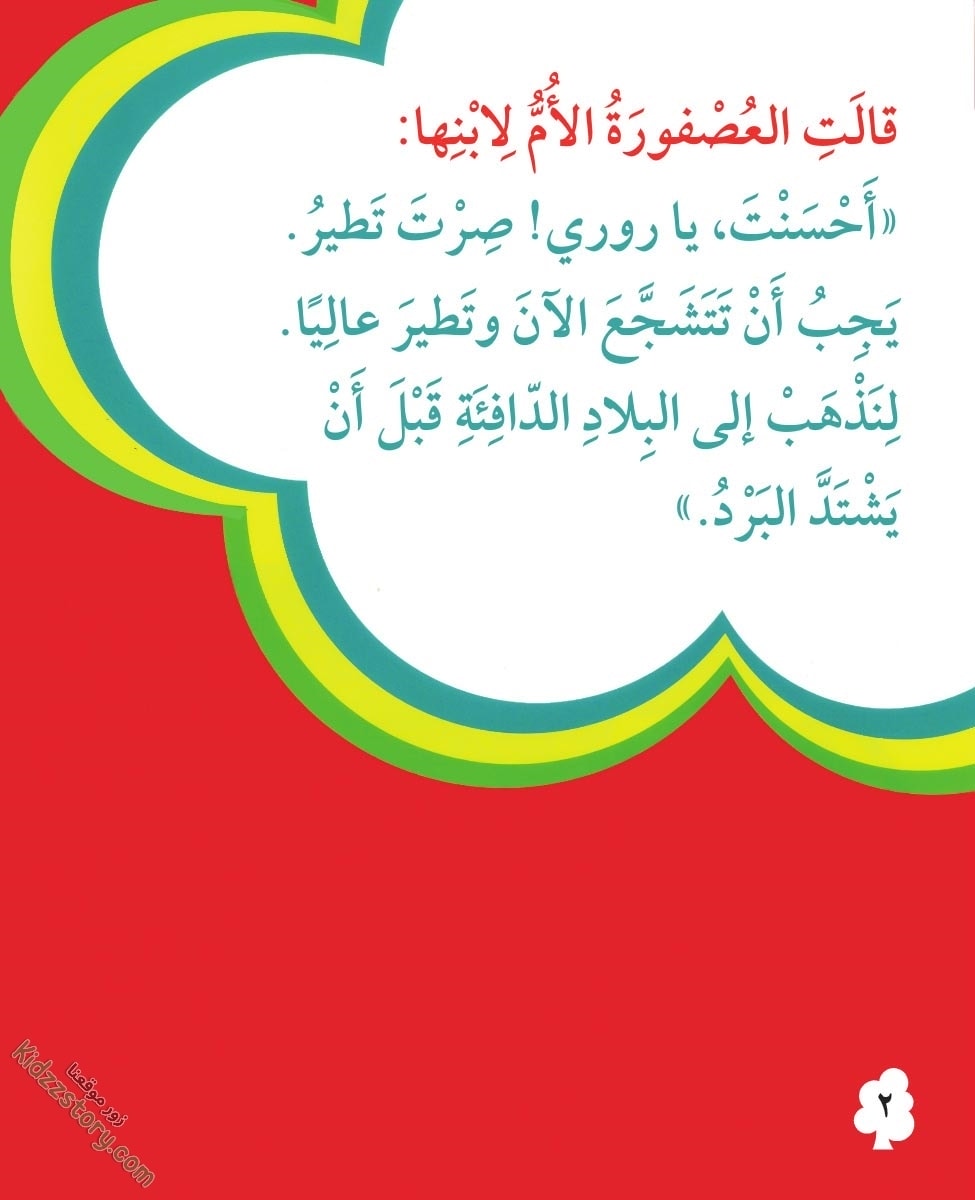 قالت العصفورة الأم لابنها: «أحسنت يا روري! صرتَ تطير. يجب أن تتشجع الآن وتطير عاليًا. لنذهب إلى البلاد الدافئة قبل أن يشتد البرد.» بدأت العصفورة الأم تعلم روري الطيران، وكيف يرفرف بجناحيه بسرعة، وترافقه في الطيران بين الشجر.