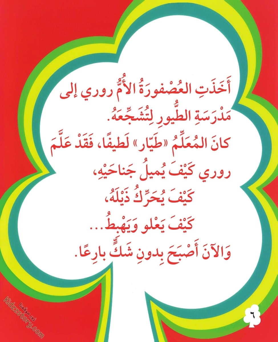 أخذت العصفورة الأم روري إلى مدرسة الطيور لتشجعه. كان المعلم «طيّار» لطيفًا، فقد علم روري كيف يميل جناحيه، كيف يحرك ذيله، كيف يعلو ويهبط… والآن أصبح بدون شك بارعًا.
