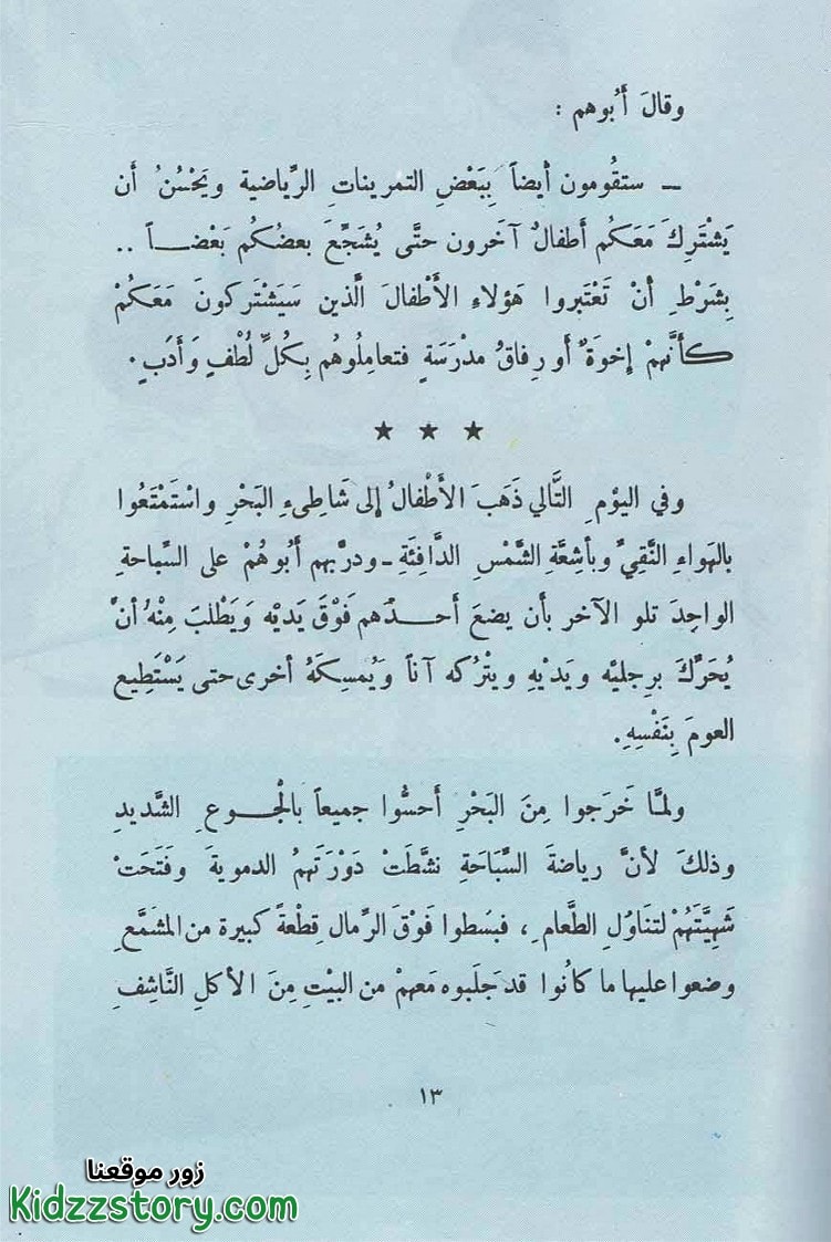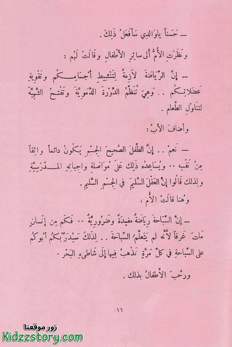 “إن السباحة رياضة مفيدة وضرورية، فكم من إنسان مات غرقًا لأنه لم يتعلم السباحة. لذلك سيدربكم أبوكم على السباحة في كل مرة تذهبون فيها إلى شاطئ البحر.”