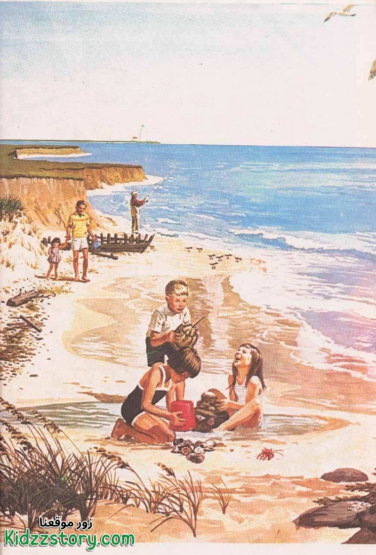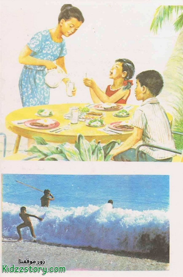 ولما خرجوا من البحر، أحسوا جميعًا بالجوع الشديد، وذلك لأن رياضة السباحة نشطت دورتهم الدموية وفتحت شهيتهم لتناول الطعام. بسطوا فوق الرمال قطعة كبيرة من المشمع، وضعوا عليها ما جلبوه معهم من الطعام مثل البيض المسلوق، الجبن، الزيتون، والكثير من الفاكهة. تحلقوا حول المائدة وراحوا يأكلون بشهية.