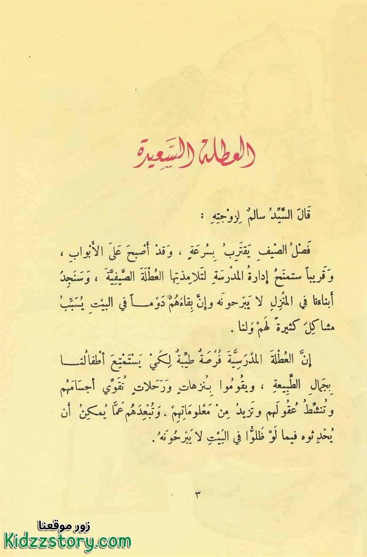 “فصل الصيف يقترب بسرعة، وقد أصبح على الأبواب، وقريباً ستمنح إدارة المدرسة لتلامذتها العطلة الصيفية، وسنجد أبناءنا في المنزل لا يبرحونه. وإن بقاءهم دوماً في البيت يسبب مشاكل كثيرة لهم ولنا.
