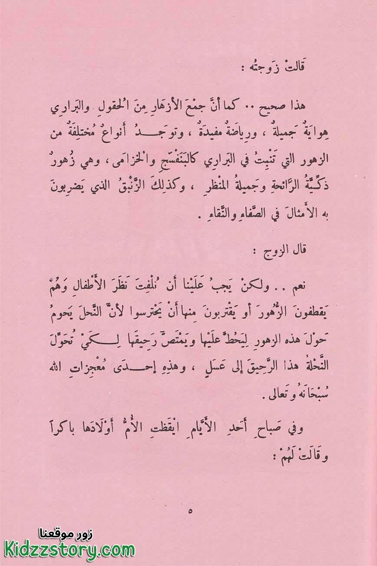 “نعم، ولكن يجب علينا أن نلفت نظر الأطفال وهم يقطفون الزهور أو يقتربون منها أن يحترسوا لأن النحل يحوم حول هذه الزهور ليحط عليها ويمتص رحيقها لكي تحول النحلة هذا الرحيق إلى عسل، وهذه إحدى معجزات الله سبحانه وتعالى.”