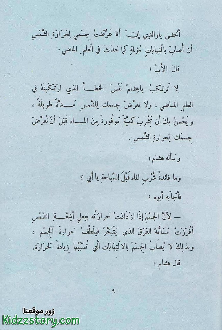 “لا ترتكب يا هشام نفس الخطأ الذي ارتكبته في العام الماضي، ولا تعرض جسمك للشمس مدة طويلة، ويفضل أن تشرب كمية موفورة من الماء قبل أن تعرض جسمك لحرارة الشمس.”