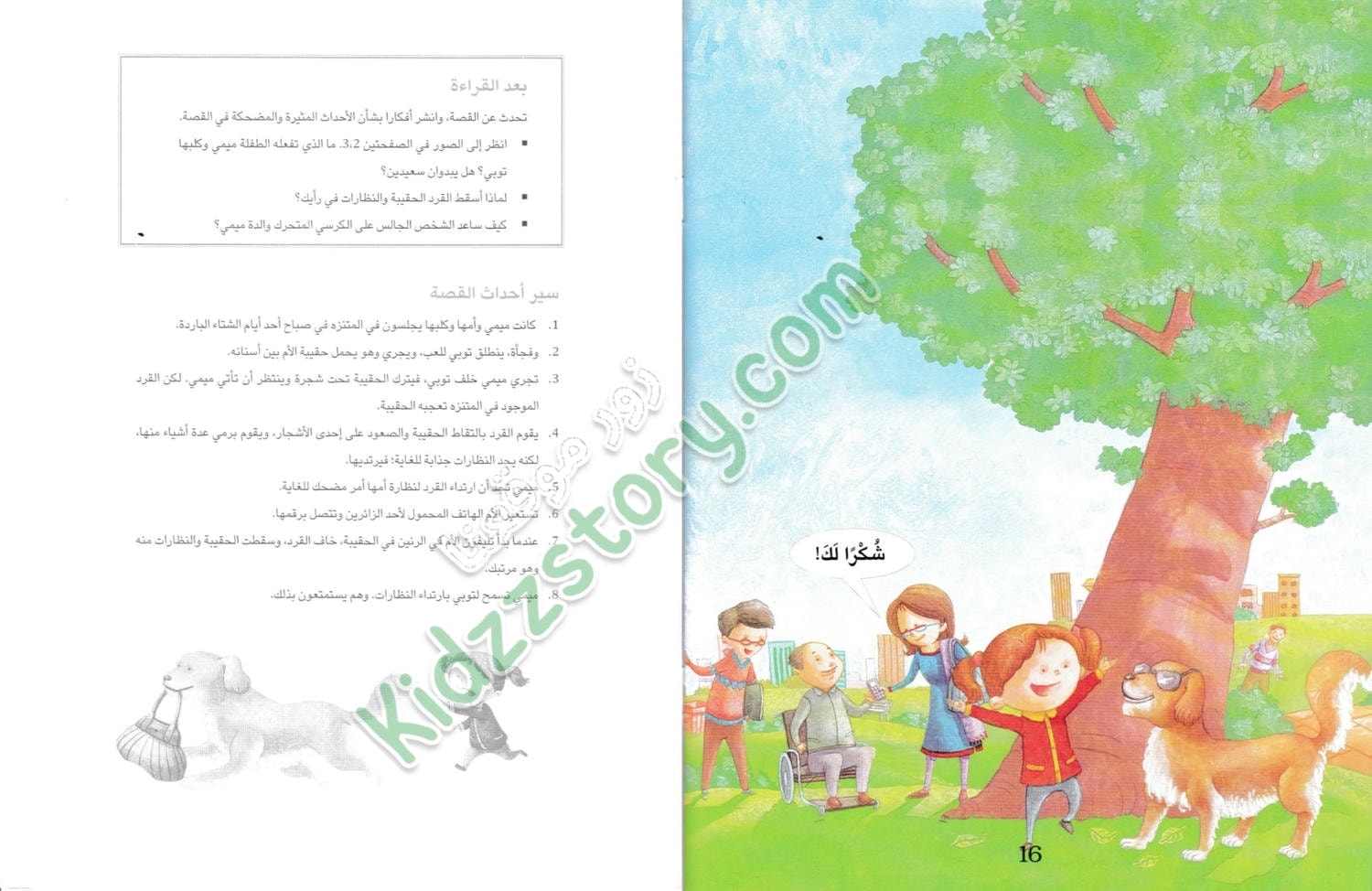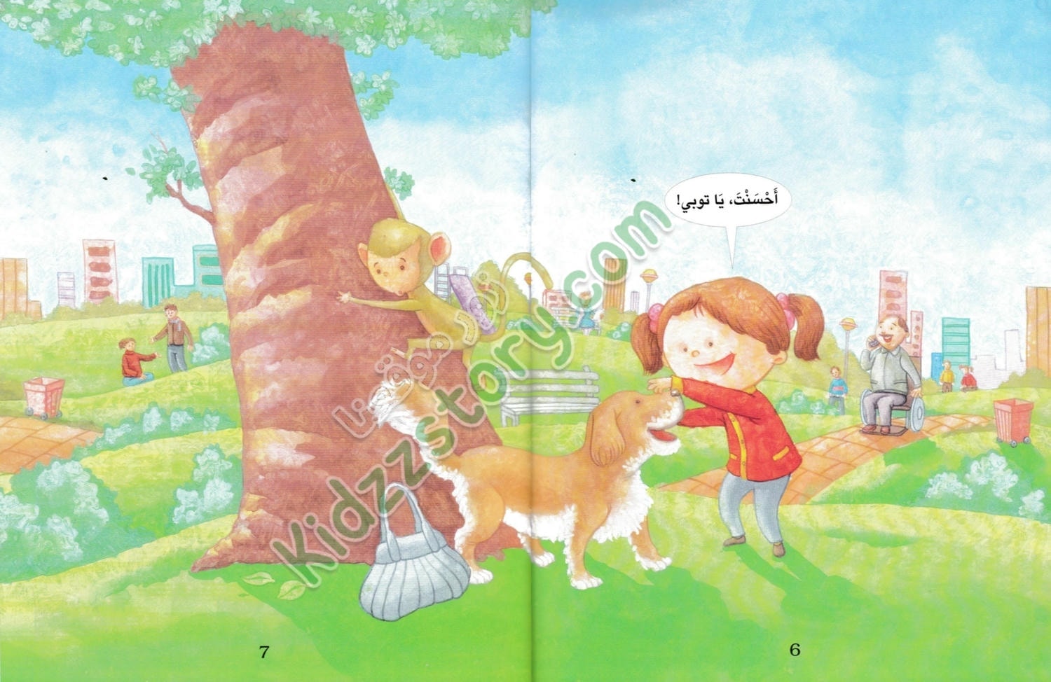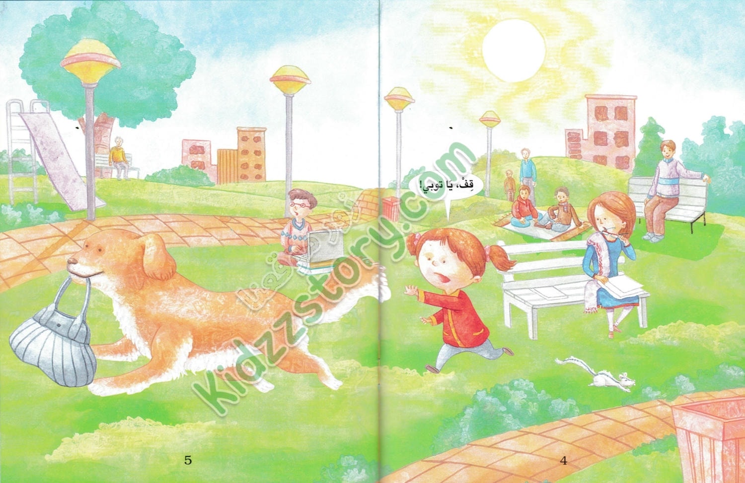 في صباح يوم شتوي بارد، كانت ميمي تجلس مع أمها وكلبها توبي في المتنزه. الجو كان لطيفًا رغم البرودة، وكانت الأشجار عارية من أوراقها ما عدا القليل الذي بقي معلقًا في الفروع. فجأة، قفز توبي من مكانه وركض بعيدًا، وهو يحمل حقيبة الأم في فمه. صدمت ميمي وبدأت تلاحقه مسرعة، متعجبة من تصرف توبي المفاجئ.