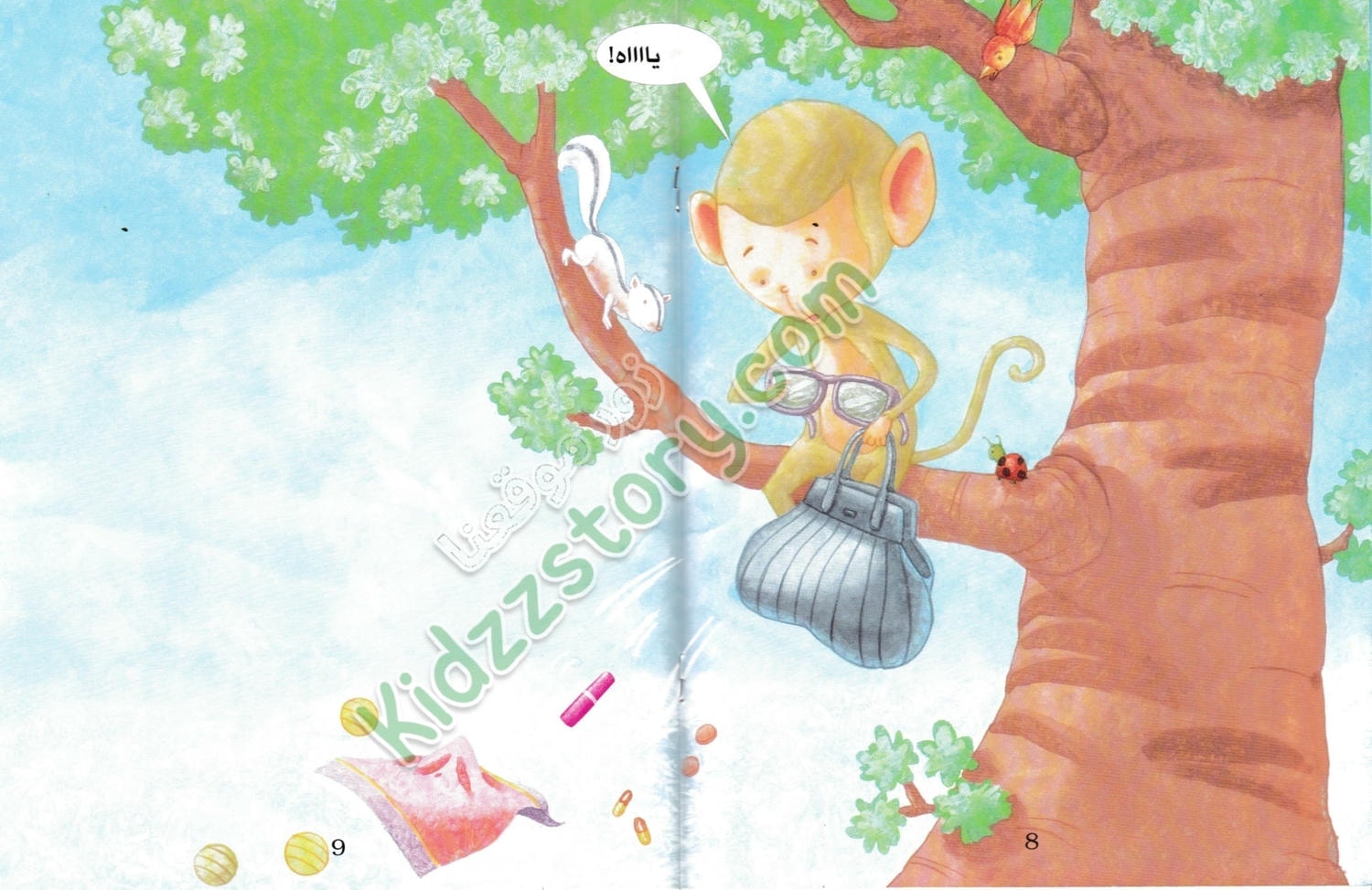 بدأ القرد برمي الأشياء من الحقيبة واحدة تلو الأخرى. سقطت منها بعض الأغراض غير المهمة على الأرض، ولكن عندما أمسك القرد بنظارات الأم، توقف فجأة. بدا له أنها شيء مميز. ارتدى القرد النظارات على وجهه الضيق، وكان مظهره مضحكًا للغاية. لم تستطع ميمي أن تتماسك نفسها من الضحك، فمشهد القرد مرتديًا النظارات كان مضحكًا إلى حد كبير.