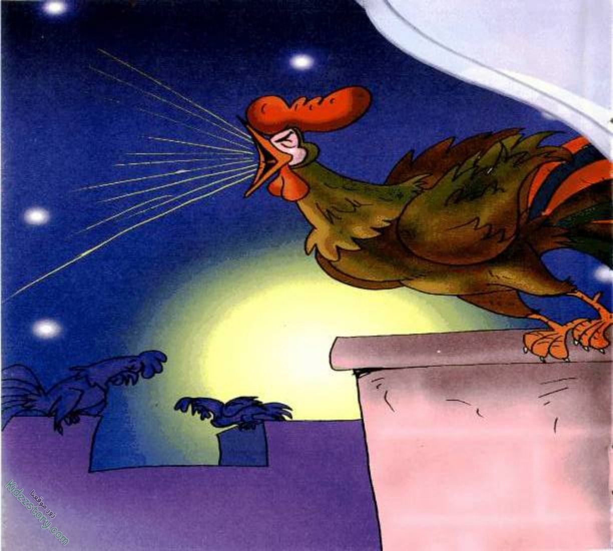 صعد الديك إلى أعلى مكان في العشة، لمعت عيناه وهو يرى الملائكة تطوف وتسبح في السماء فانطلق يناجي ربه القدير بأعلى صوت. أذن كما لم يؤذن ديك من قبل.