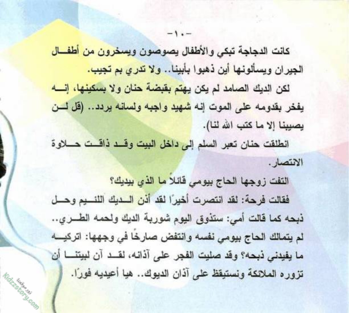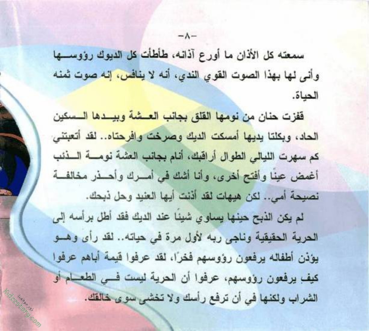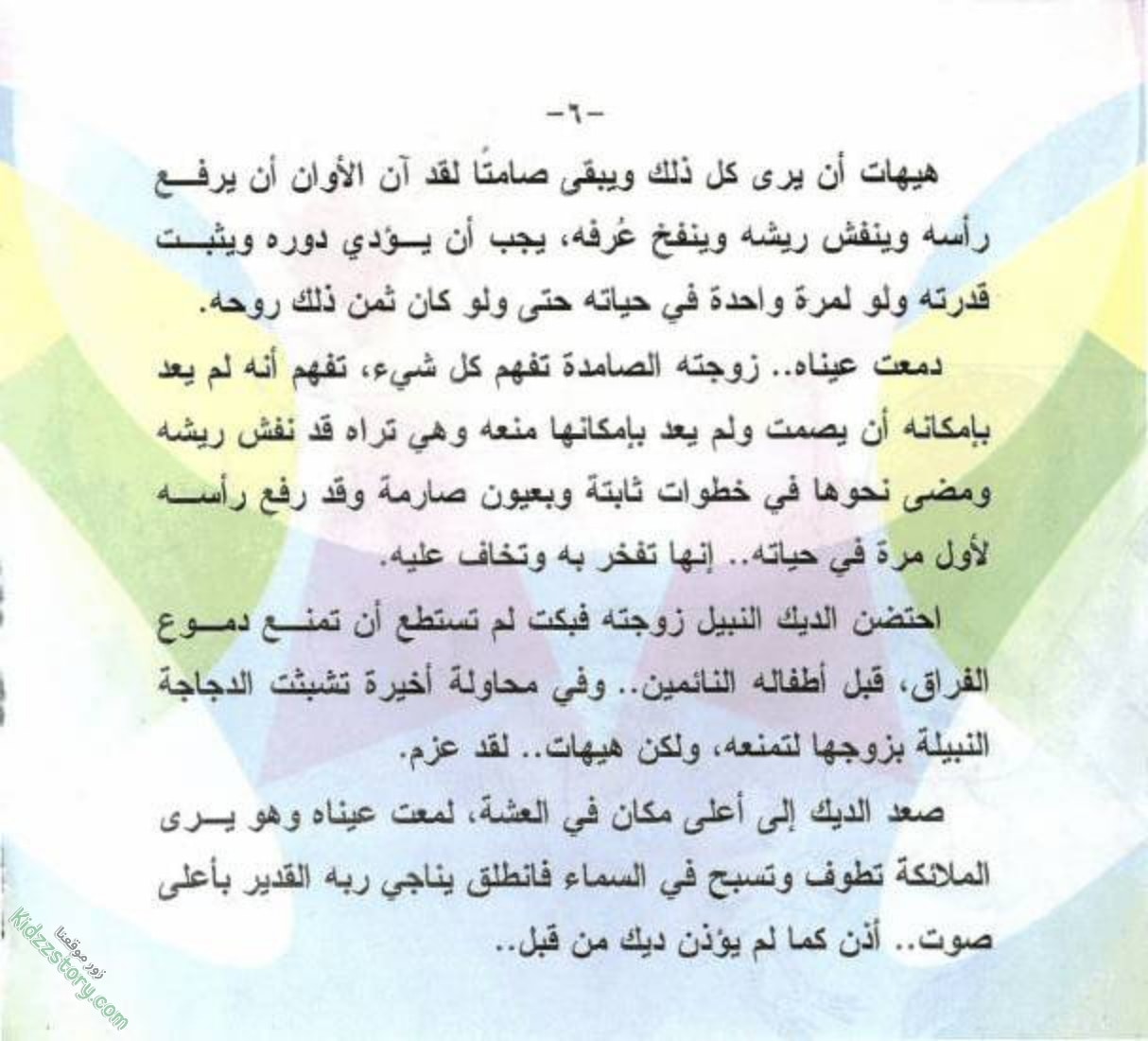 لكن الديك الصامد لم يكن يهتم بقبضة حنان ولا بسكينها، إنه يفخر بقدومه على الموت، إنه شهيد واجبه ولسانه يردد “قل لن يصيبنا إلا ما كتب الله لنا.”