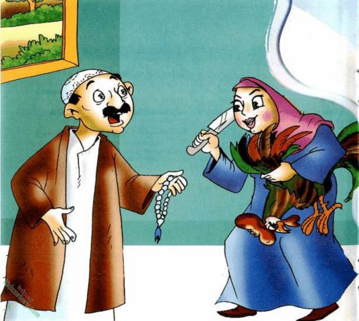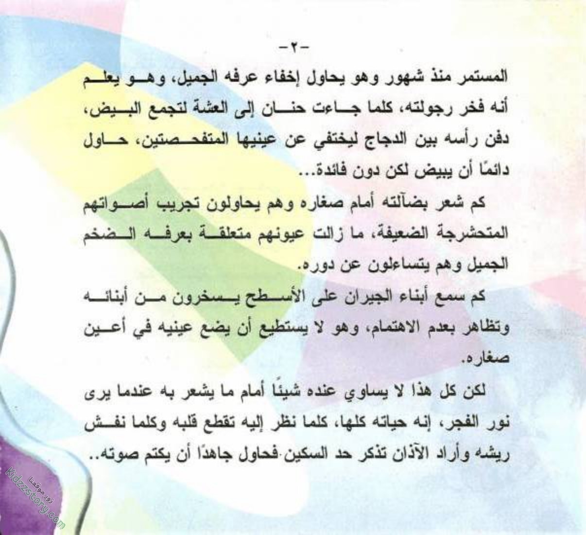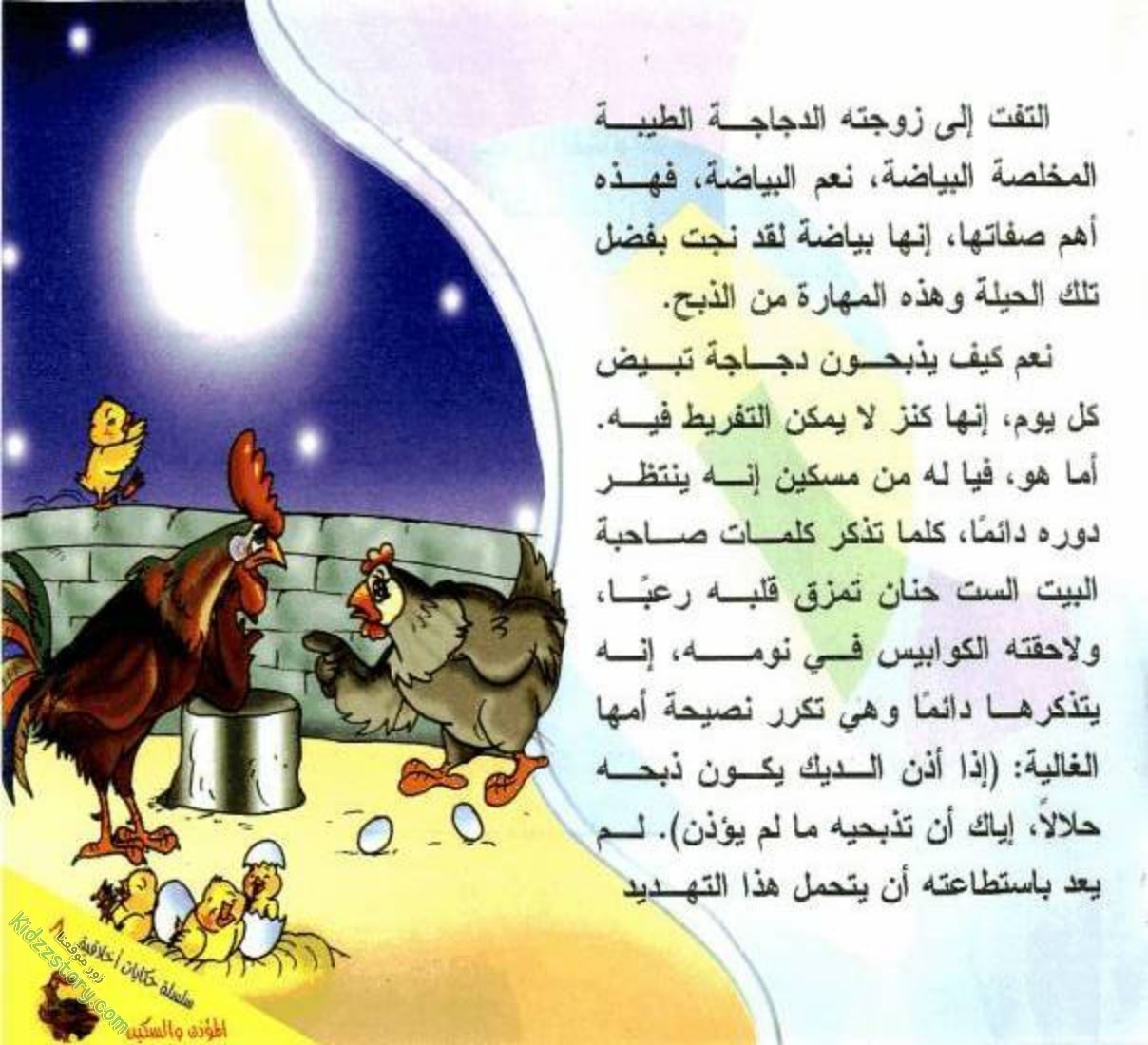التفت إلى زوجته الدجاجة الطيبة المخلصة البياضة، نعم البياضة، فهذه أهم صفاتها، إنها بياضة. لقد نجت بفضل تلك الحيلة وهذه المهارة من الذبح. نعم كيف يذبحون دجاجة تبيض كل يوم، إنها كنز لا يمكن التفريط فيه. أما هو فيا له من مسكين، إنه ينتظر دوره دائما، كلما تذكر كلمات صاحبة البيت الست حنان تمزق قلبه رعبا، ولاحقته الكوابيس في نومه، إنه يتذكرها دائما وهي تكرر نصيحة أمها الغالية: “إذا أذن الديك يكون ذبحه حلالا، إياك أن تذبحيه ما لم يؤذن.”