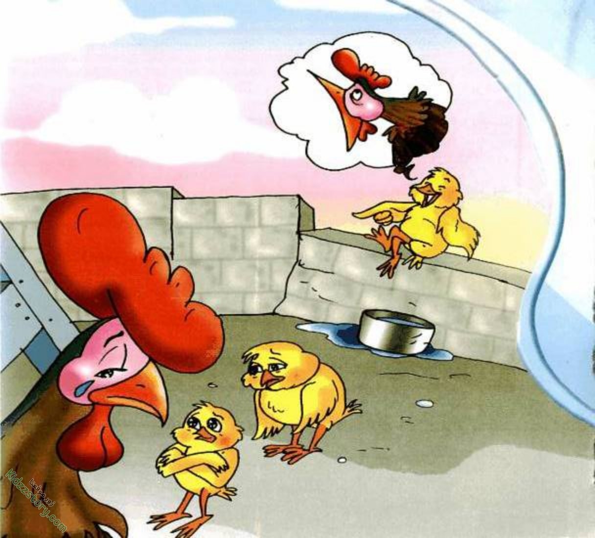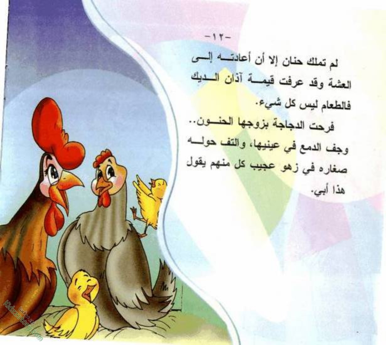 فرحت الدجاجة بزوجها الحنون، وجف الدمع في عينيها، والتف حوله صغاره في زهو عجيب كل منهم يقول: “هذا أبي.”
