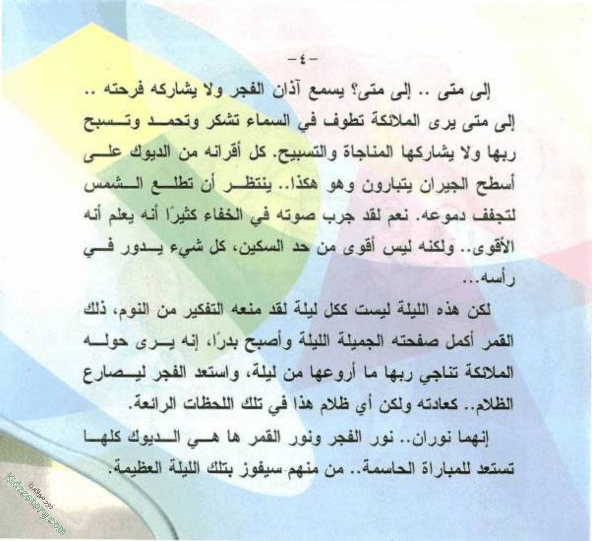 لكن هذه الليلة ليست ككل ليلة، لقد منعه التفكير من النوم، ذلك القمر أكمل صفحته الجميلة الليلة وأصبح بدرا، إنه يرى حوله الملائكة تناجي ربها، ما أروعها من ليلة، واستعد الفجر ليصارع الظلام كعادته، ولكن أي ظلام هذا في تلك اللحظات الرائعة. إنهما نوران، نور الفجر ونور القمر. ها هي الديوك كلها تستعد للمباراة الحاسمة، من منهم سيفوز بتلك الليلة العظيمة.