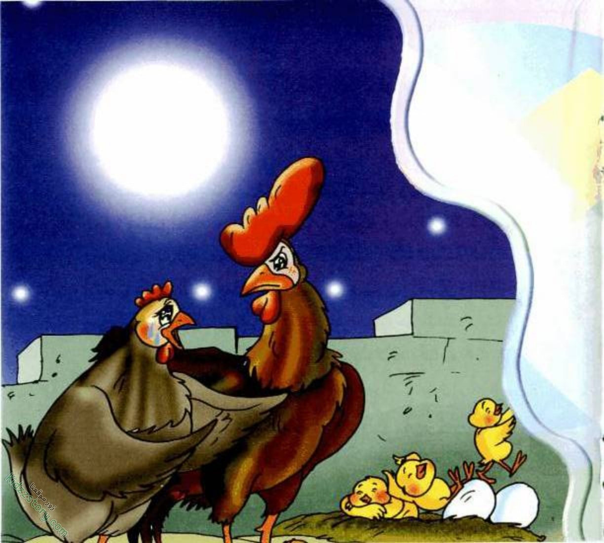احتضن الديك النبيل زوجته فبكت، لم تستطع أن تمنع دموع الفراق، قبل أطفاله النائمين. وفي محاولة أخيرة تشبثت الدجاجة النبيلة بزوجها لتمنعه، ولكن هيهات، لقد عزم.
