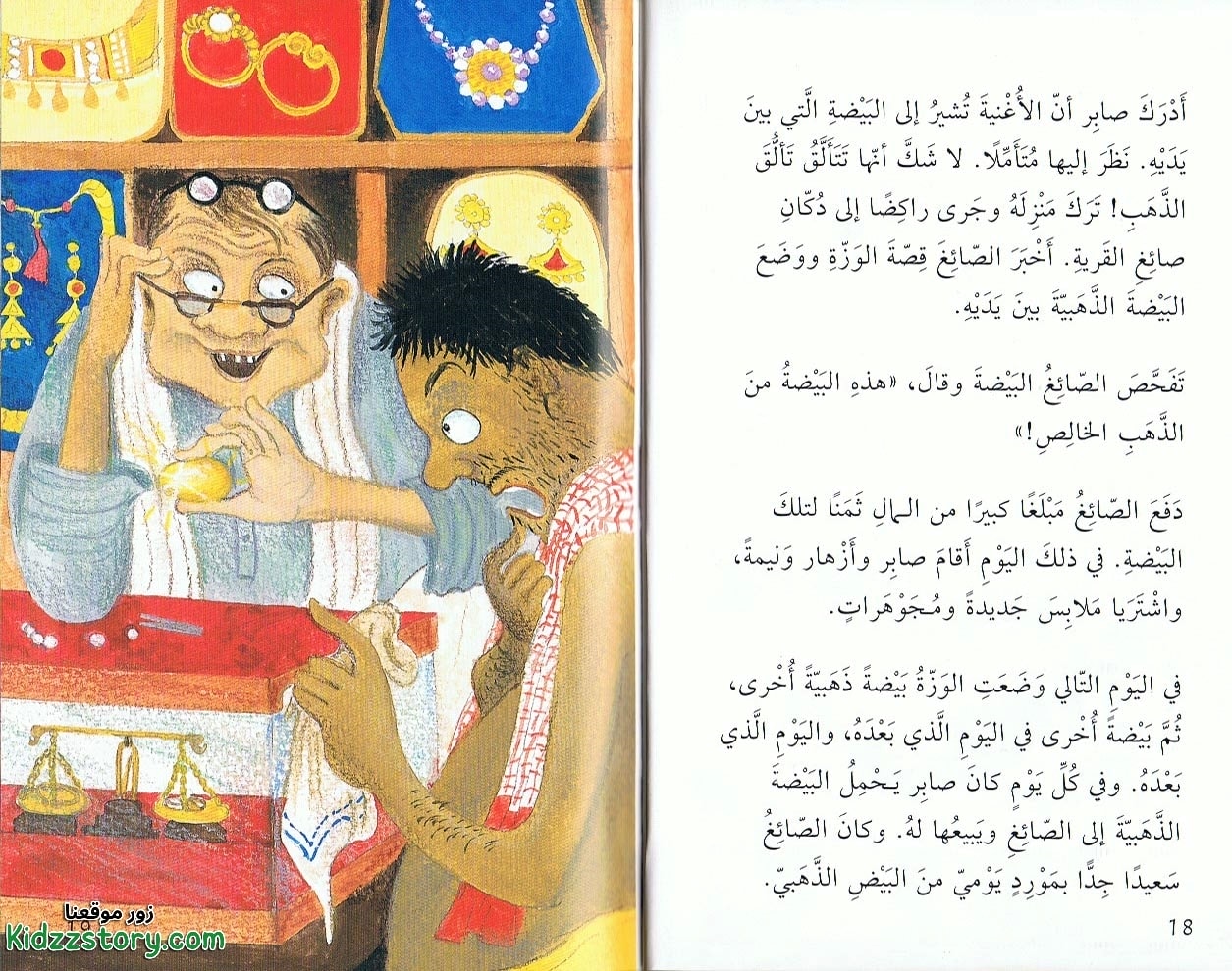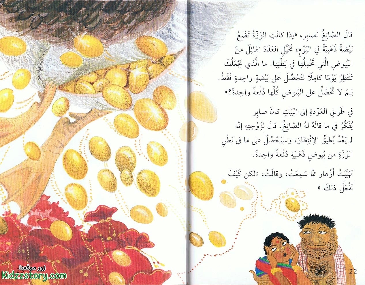 قال الصائغ لصابر: “إذا كانت الوزة تضع بيضة ذهبية في اليوم، تخيل العدد الهائل من البيوض التي تحملها في بطنها. ما الذي يجعلك تنتظر يومًا كاملًا لتحصل على بيضة واحدة فقط؟ لماذا لا تحصل على البيوض كلها دفعة واحدة؟”