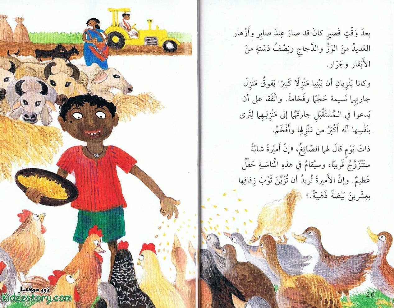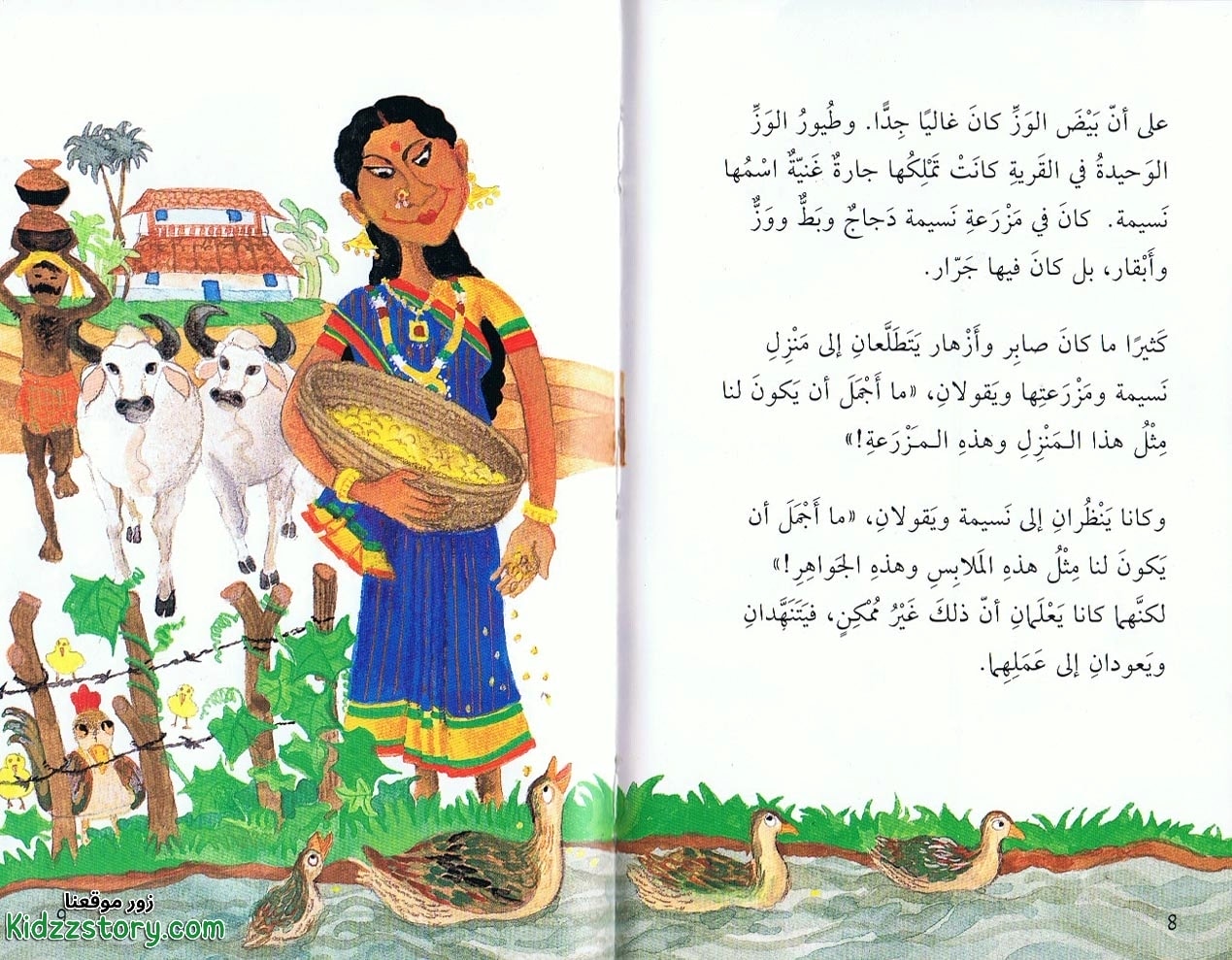على أن بيض الوز كان غالبًا نادرًا. طيور الوز الوحيدة في القرية كانت تملكها جارة غنية اسمها نسيمة. كان في مزرعة نسيمة دجاج، بط، وز، وأبقار، بل كان فيها جرار. كثيرًا ما كان صابر وأزهار يتطلعان إلى منزل نسيمة ومزرعتها ويقولان، “ما أجمل أن يكون لنا مثل هذا المنزل وهذه المزرعة!” وكانا ينظران إلى نسيمة ويقولان، “ما أجمل أن يكون لنا مثل هذه الملابس وهذه الجواهر!” لكنهما كانا يعلمان أن ذلك غير ممكن، فيتنهدان ويعودان إلى عملهما.