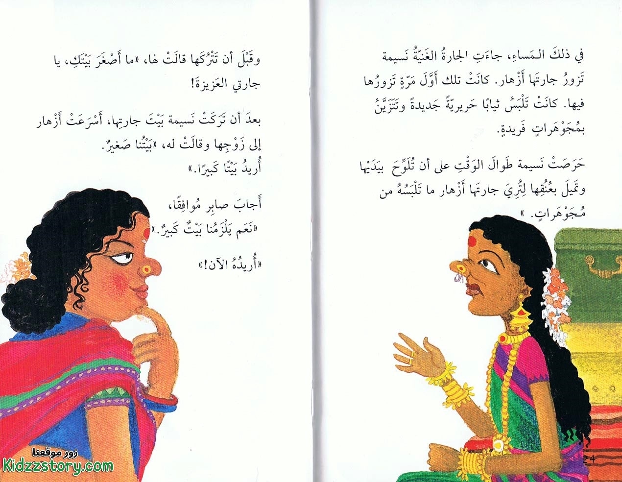 بعد أن تركت نسيمة بيت جارتها، أسرعت أزهار إلى زوجها وقالت له: “بيتنا صغير. أريد بيتًا كبيرًا.”