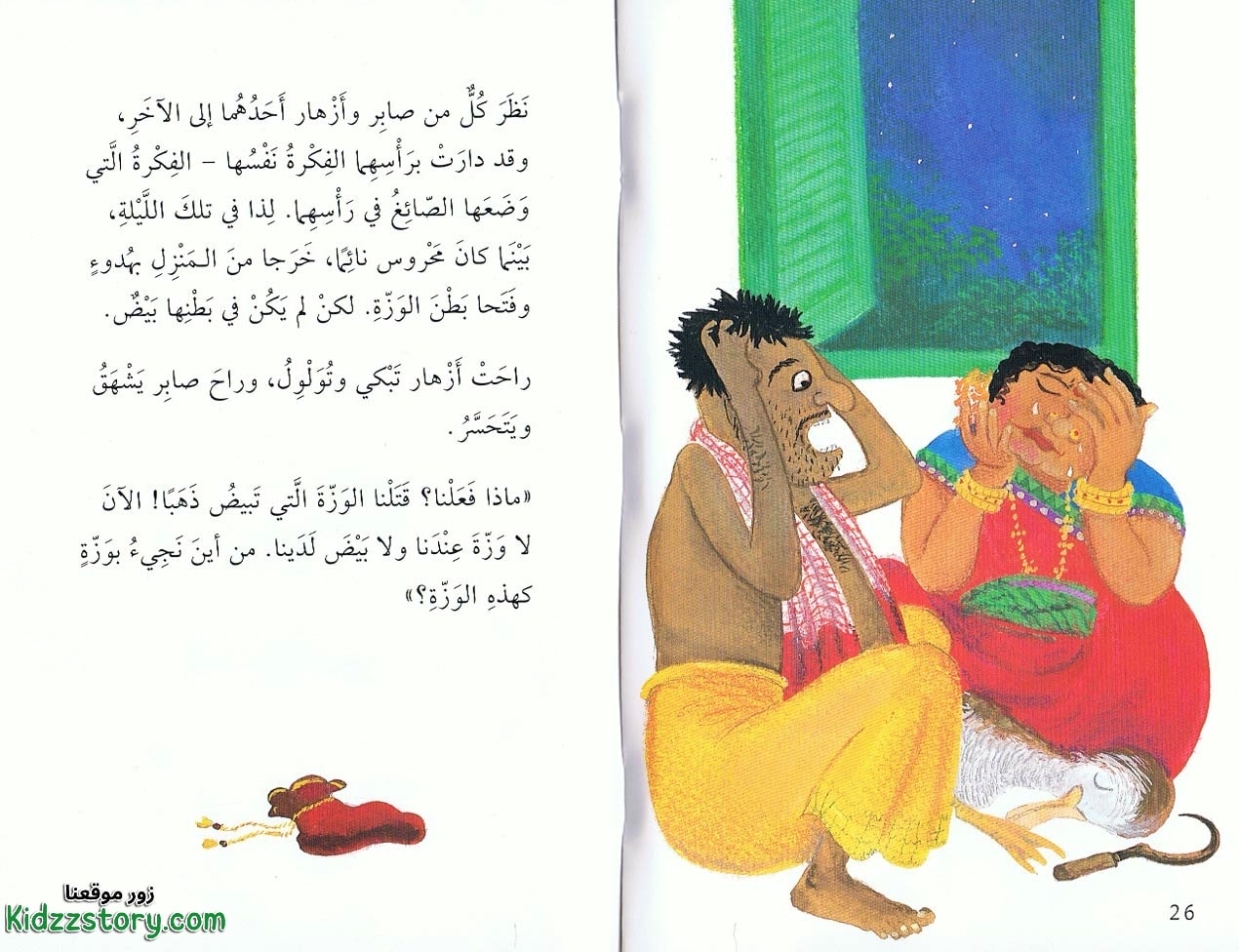 في طريق العودة إلى البيت، كان صابر يفكر في ما قاله له الصائغ. قال لزوجته: “إني لم أعد أطيق الانتظار، وسأحصل على ما في بطن الوزة من بيوض ذهبية دفعة واحدة.”