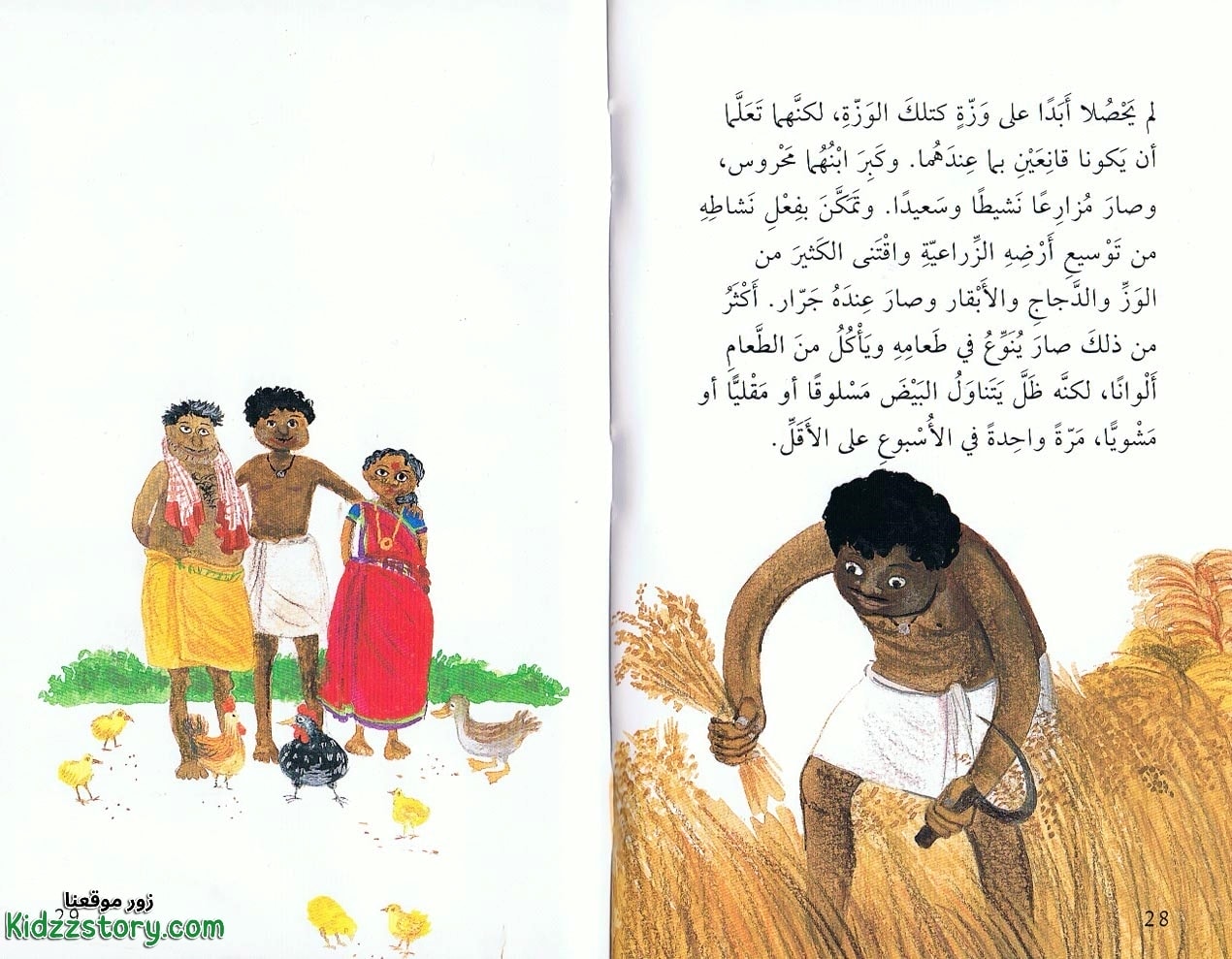 ظل صابر وأزهار يعملان ليل نهار ليوفرا لمحروس ما يكفيه من بيض. اشتريا لأجل ذلك دجاجة، لكن بيض تلك الدجاجة كان صغيرًا، ولم تكن تضع إلا بيضة واحدة كل ثلاثة أيام. لذا كان على الوالدين أن يواصلا العمل في الحقل بجد ليُوفرا لابنهما طعامه المفضل.