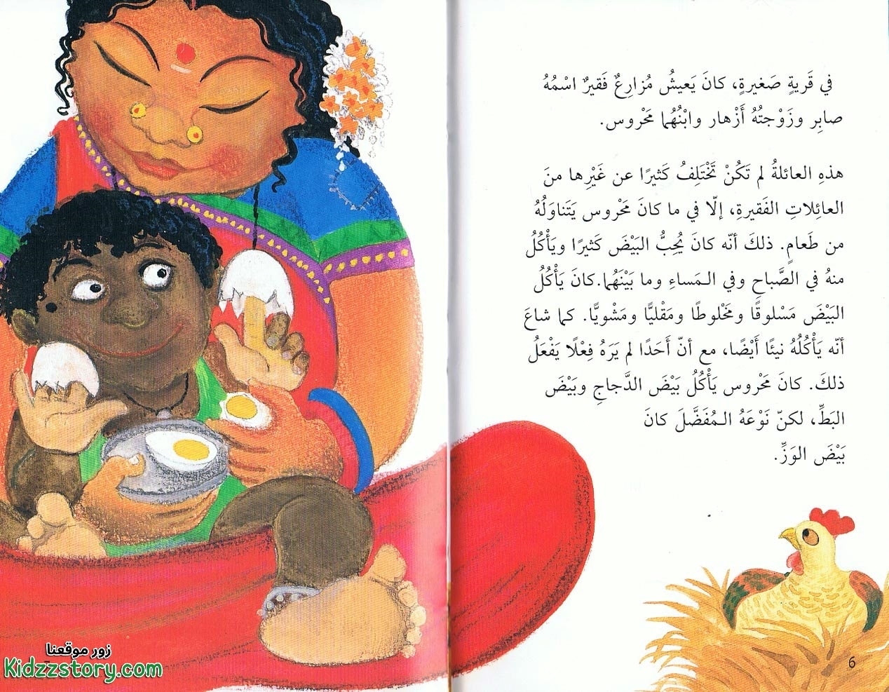 في قرية صغيرة، كان يعيش مزارع فقير اسمه صابر وزوجته أزهار وابنهما محروس. هذه العائلة لم تكن تختلف كثيرًا عن غيرها من العائلات الفقيرة، إلا في ما كان محروس يتناوله من طعام. ذلك أنه كان يحب البيض كثيرًا ويأكل منه في الصباح وفي المساء وما بينهما. كان يأكل البيض مسلوقًا، مخلوطًا، مقليًا، ومشويًا. كما شاع أنه يأكله نيئًا أيضًا، مع أن أحدًا لم يره فعلاً يفعل ذلك. كان محروس يأكل بيض الدجاج وبيض البط، لكن نوعه المفضل كان بيض الوز.