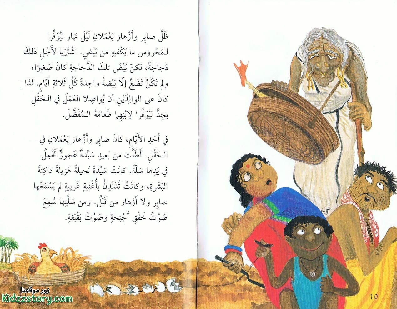 في أحد الأيام، كان صابر وأزهار يعملان في الحقل. أطلت من بعيد سيدة عجوز تحمل في يدها سلة. كانت سيدة نحيلة هزيلة داكنة البشرة، وكانت تدندن بأغنية غريبة لم يسمعها صابر ولا أزهار من قبل. ومن سلتها سمع صوت خفق أجنحة وصوت بقْبقة.